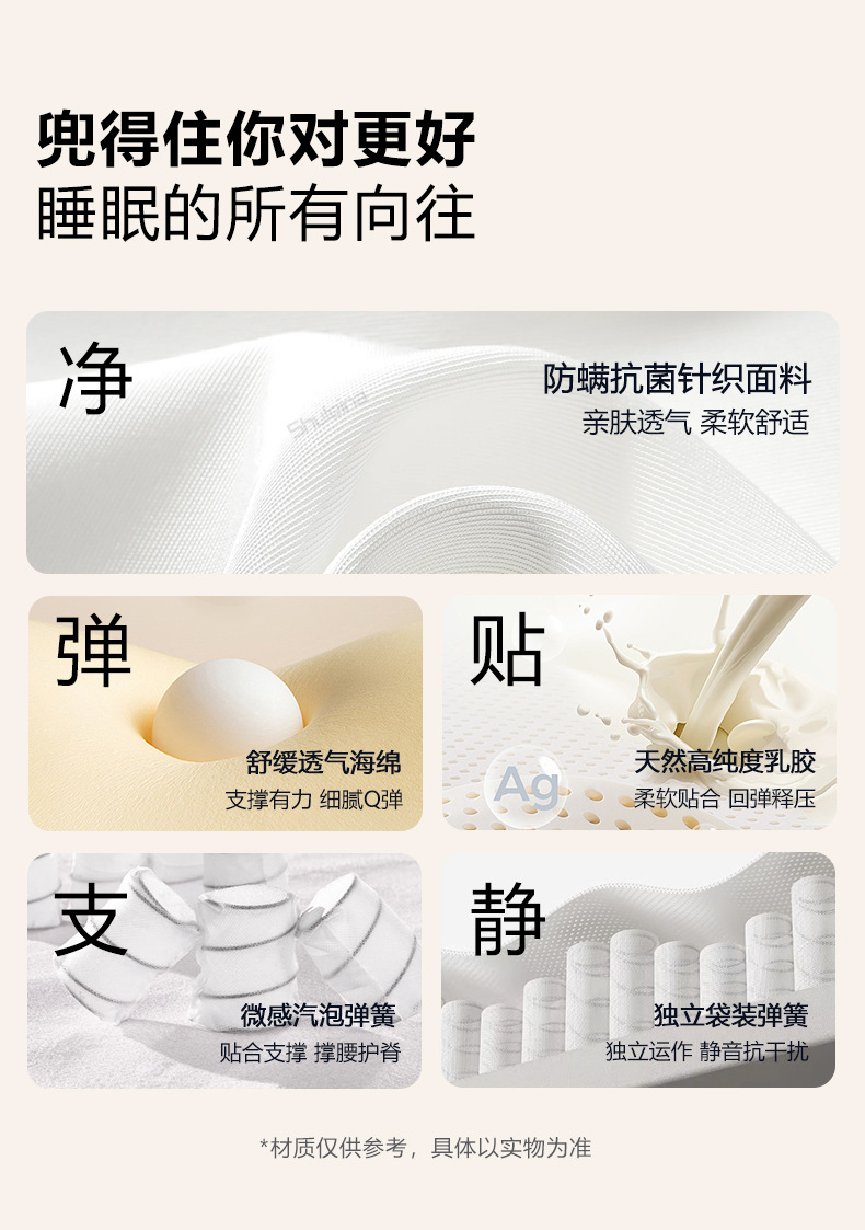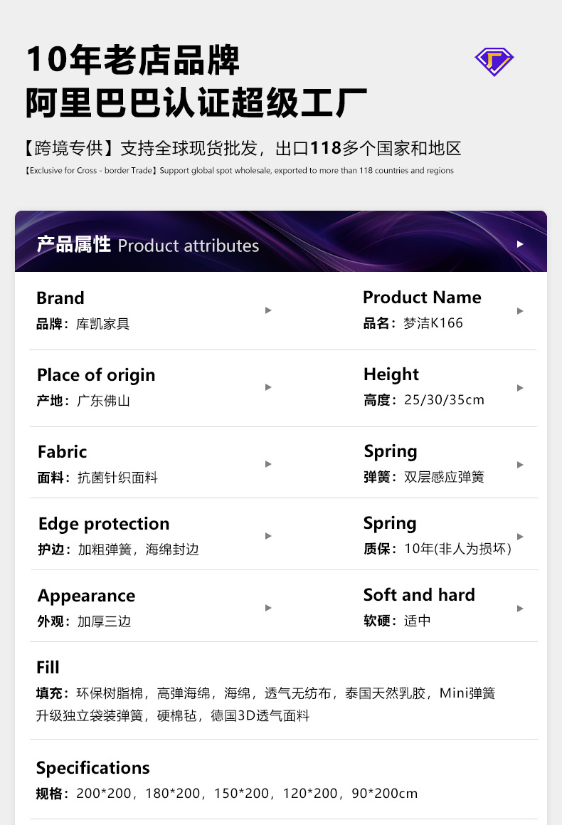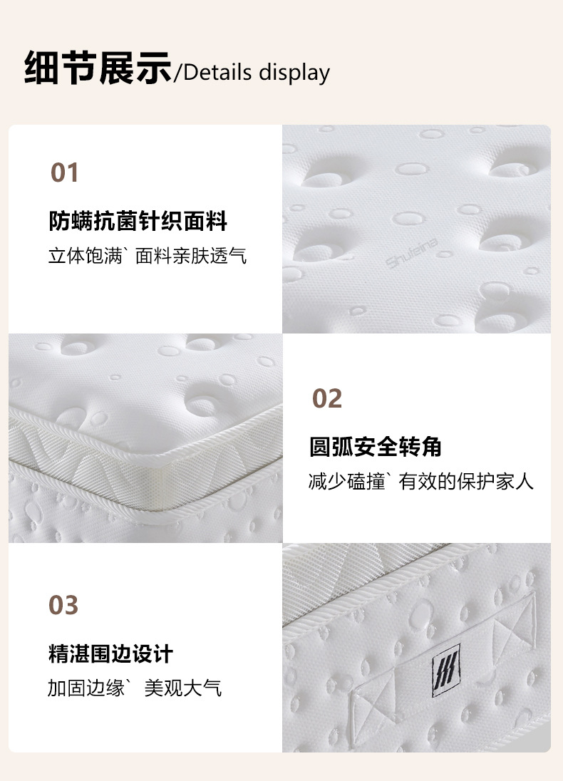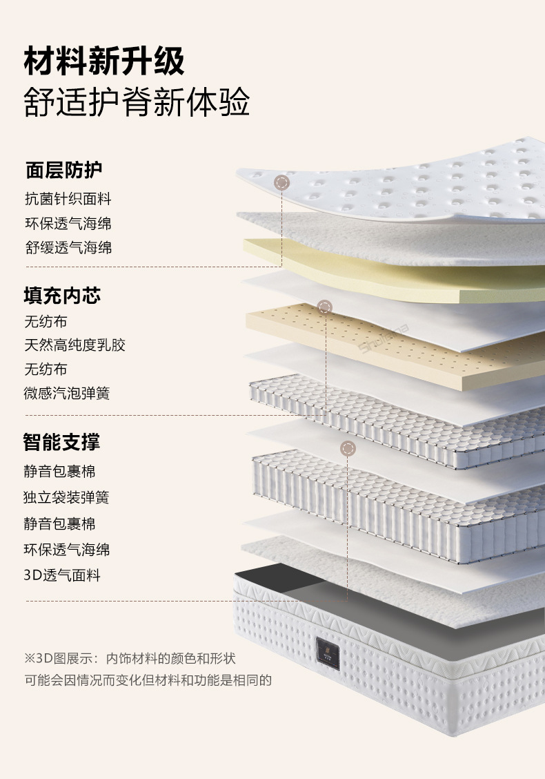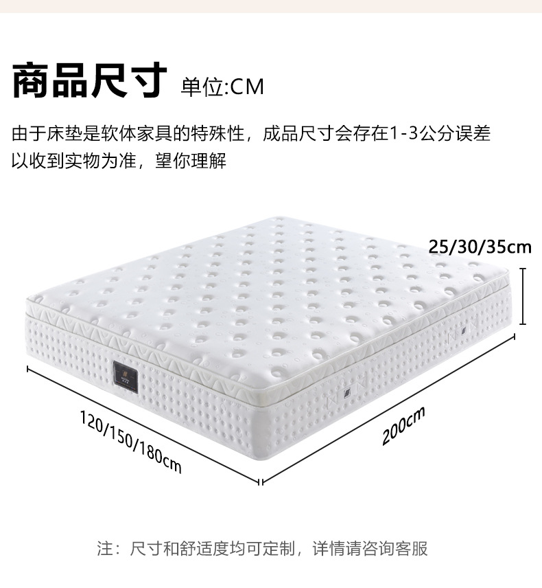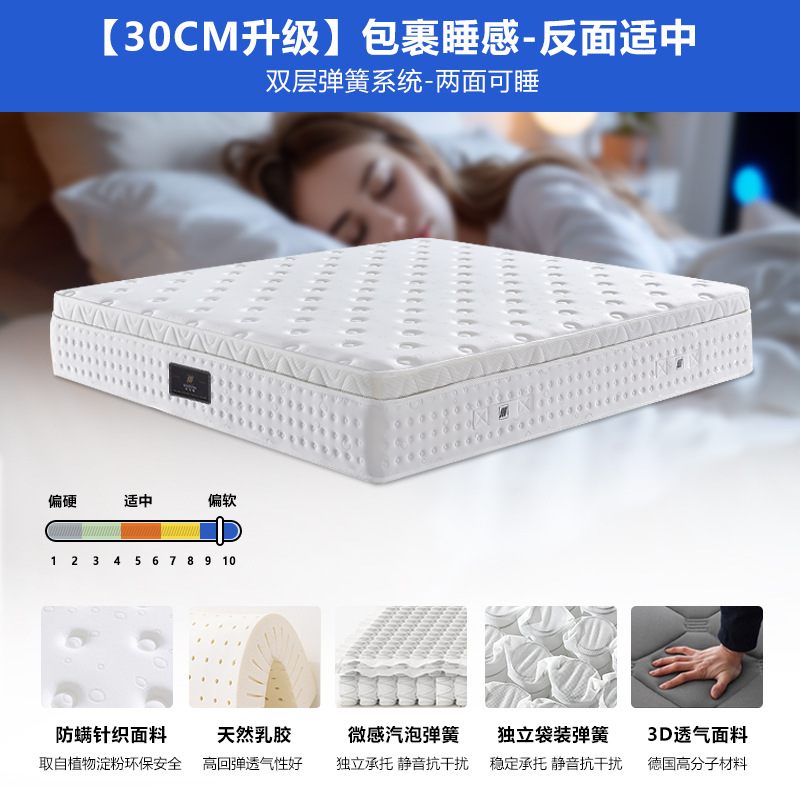 25 см толщиной двойной слой пружины системы: натуральный латекс + высокая эластичная мини-сумка Весна + Высокая поддержка независимых хребет защиты Spring + 3D ткань умеренный фронт/средний мягкий и жесткий Назад; 30 см Толстая двойная пружинная система: натуральный латекс + высокоэластичный мини-мешок Spring + Высокая поддержка независимой защиты хребта Spring + 3D ткань спереди мягкая, а сзади жесткая; Двойная пружинная система толщиной 35 см: натуральный латекс + высокоэластичная мини-сумка Spring + Высокопрочная независимая пружина для защиты хребтов + 3D ткань спереди очень мягкая, а Спинка жесткая; Модернизация двухслойной пружинной системы толщиной 25 см: натуральный латекс + высокоэластичная мини-сумка Весна + независимая сумка Весна + 3D ткань спереди мягкая и умеренная спинка; Модернизация двухслойной пружинной системы толщиной 30 см: натуральный латекс + высокоэластичная мини-сумка Spring + независимая сумка Spring + 3D ткань с мягкой передней и умеренной спинкой