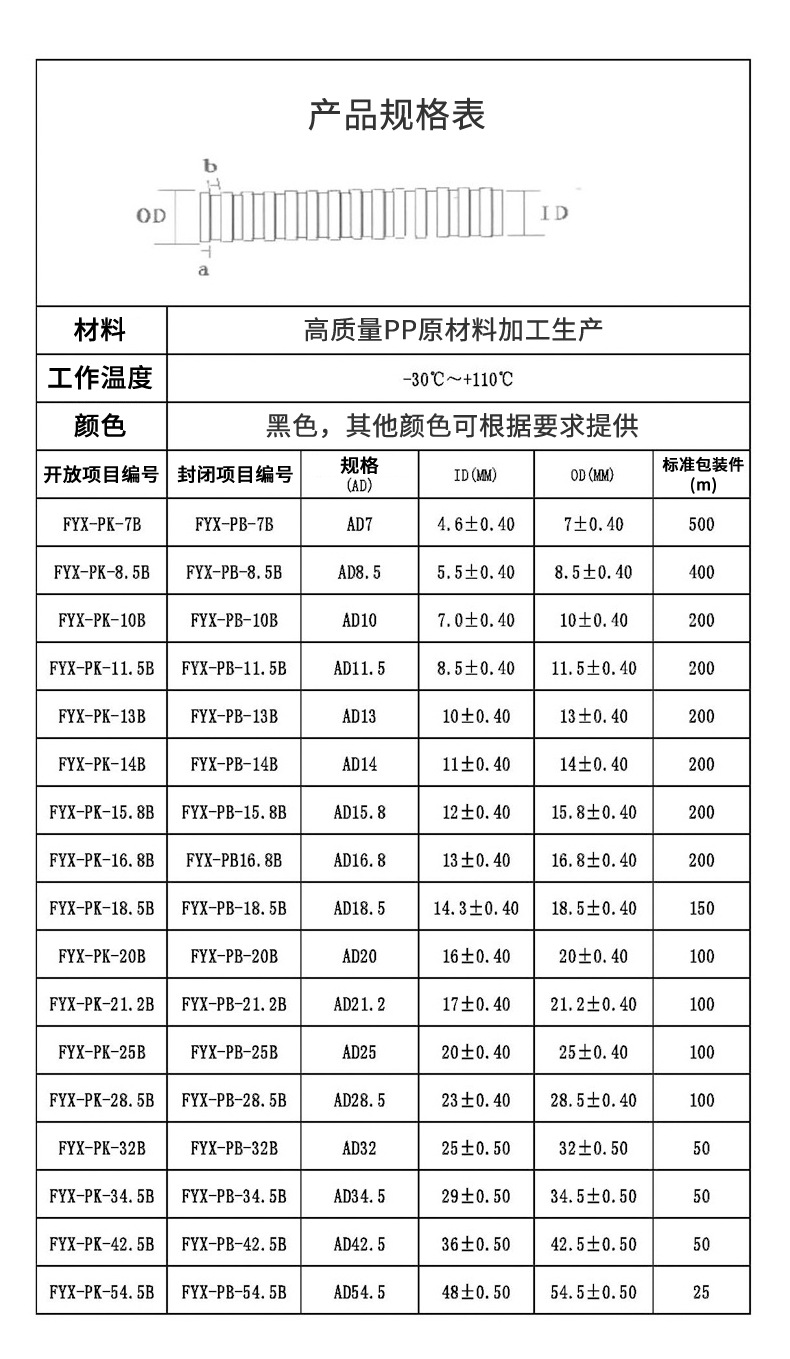 AD7 (внутренний диаметр 4,6 мм * внешний диаметр 7 мм); AD7.6 (внутренний диаметр 5,2 мм * внешний диаметр 7,6 мм); AD8.5 (внутренний диаметр 5,5 мм * внешний диаметр 8,5 мм); AD10 (внутренний диаметр 7 мм * внешний диаметр 10 мм); AD11.5 (внутренний диаметр 8,5 мм * внешний диаметр 11,5 мм); AD12.7 (внутренний диаметр 9 мм * внешний диаметр 12,7 мм); AD13 (внутренний диаметр 10 мм * внешний диаметр 13 мм); AD14 (внутренний диаметр 11 мм*внешний диаметр 14 мм); AD15.8 (внутренний диаметр 12 мм * внешний диаметр 15,8 мм); AD16.8 (внутренний диаметр 13 мм * внешний диаметр 16,8 мм); AD18,5 (внутренний диаметр 14,3 мм * внешний диаметр 18,5 мм); AD20 (внутренний диаметр 16 мм * внешний диаметр 20 мм); AD21.2 (внутренний диаметр 17 мм * внешний диаметр 21,2 мм); AD22.2 (внутренний диаметр 19 мм*внешний диаметр 22,2 мм); AD25 (внутренний диаметр 20 мм * внешний диаметр 25 мм); AD27,5 (внутренний диаметр 21 мм*внешний диаметр 27,5 мм); AD28,5 (внутренний диаметр 23 мм * внешний диаметр 28,5 мм); AD32 (внутренний диаметр 25 мм*внешний диаметр 32 мм); AD34.5 (внутренний диаметр 29 мм*внешний диаметр 34,5 мм); AD39 (внутренний диаметр 32 мм*внешний диаметр 39 мм); AD42.5 (внутренний диаметр 36 мм*внешний диаметр 42,5 мм); AD54.5 (внутренний диаметр 48 мм*внешний диаметр 54,5 мм)