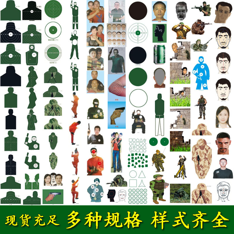 Цельное нагрудное кольцо 80 г, 50*50 см (военный зеленый с кольцом); Цельное нагрудное кольцо 80 г 50*50 см (черное с кольцом); 80 г мишень для груди 50*50 см (без кольца армейского зеленого цвета); Головная мишень 50*30см (с кольцом); Головная мишень 50*30см (без кольца); Кольцевая мишень 15*15см.; Кольцо-мишень для снайпера 4*4см (1); Кольцо-мишень для снайпера 6*6см (2)
