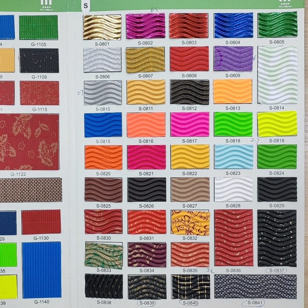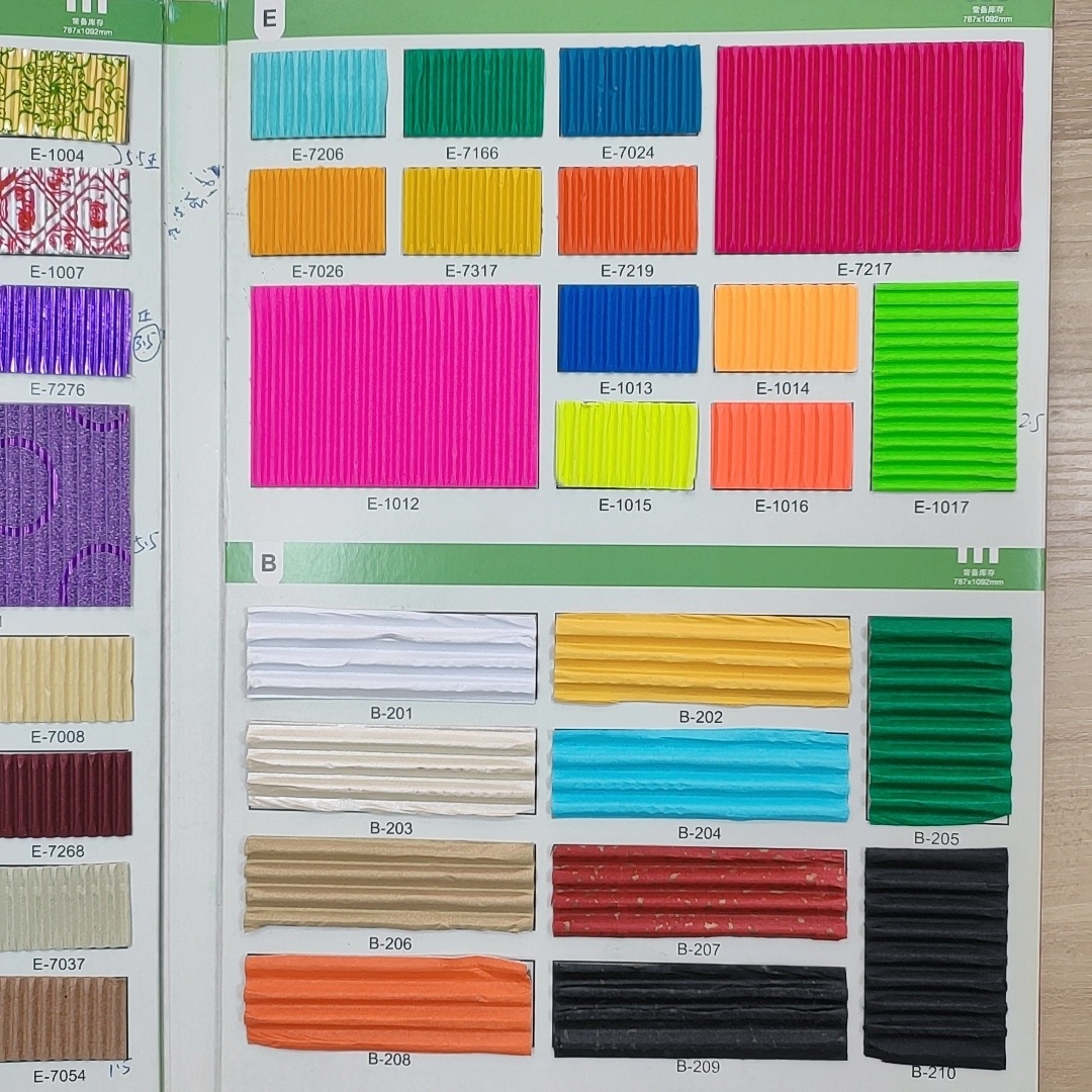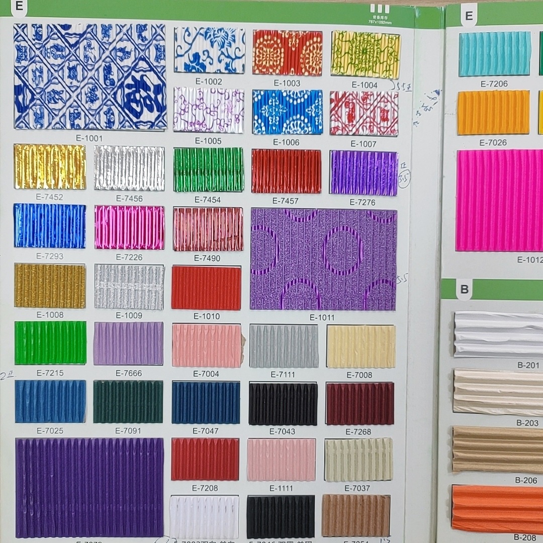 (2)我司彩色坑纸主要分为印花.镀铝.金葱.水墨.珠光.荧光等多款可供选择、本厂产品颜色丰富多样.挺度强.抗压性好、