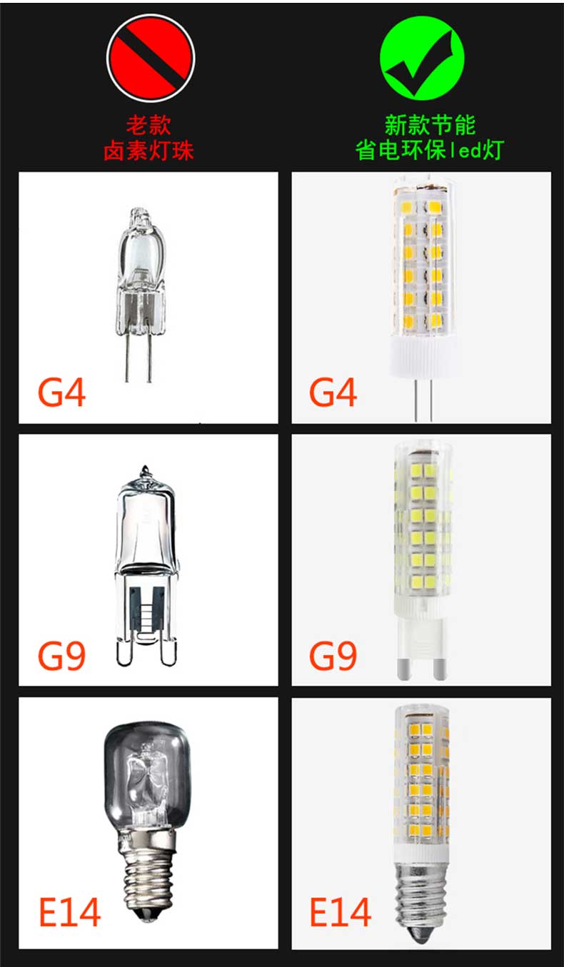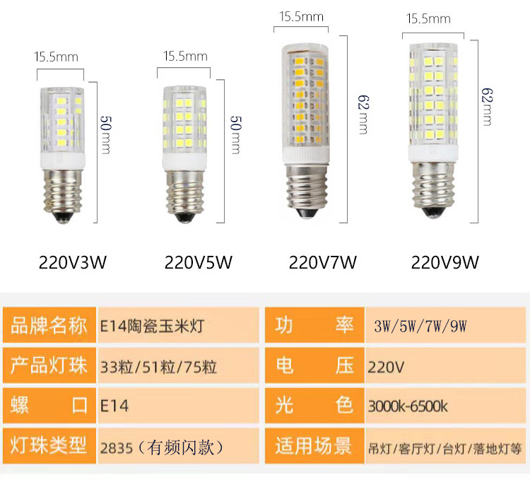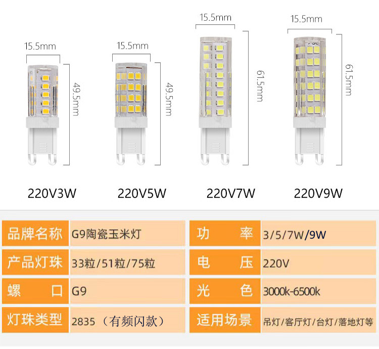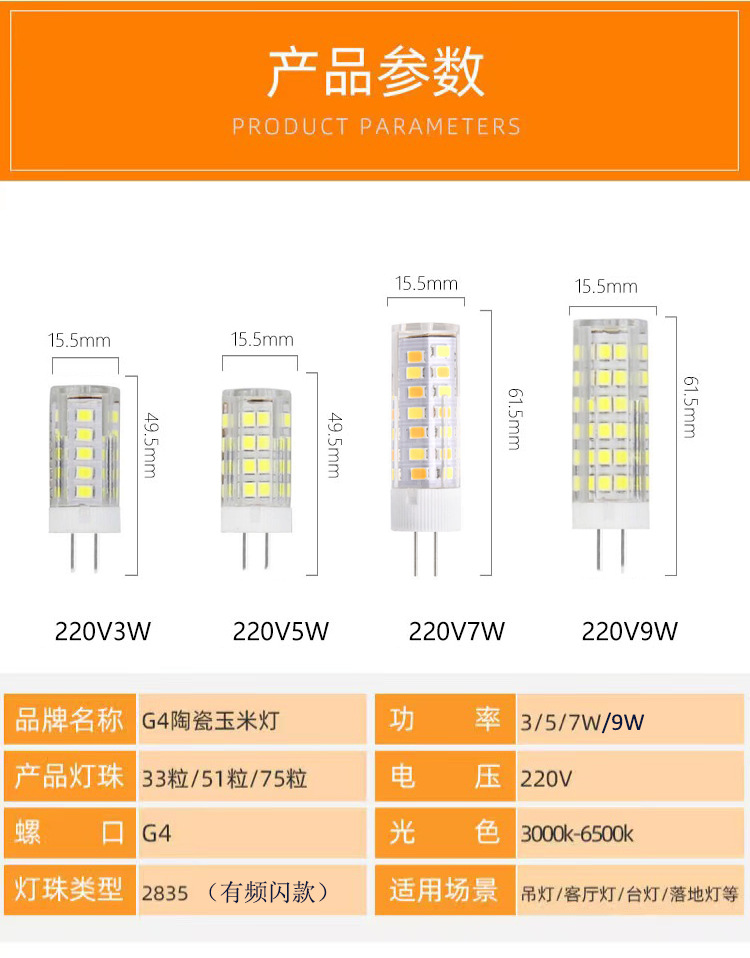 G9-33 бусины-3Вт-бытовая обычная модель; G9-короткий стиль 51 бусина-5W-обычный стиль для домашнего использования; G9-длинный стиль 51 бусина-7W-обычный стиль для домашнего использования; G9-длинный стиль 75 бусин-9W-обычный стиль для домашнего использования; G9-короткий 28 бусин-3W-супер яркий без мерцания; G9-короткий 52 бусины-5Вт-супер яркий без мерцания; G9-длинный 52 бусины-7Вт-супер яркий без мерцания; G9-длинный 75 бусин-9Вт-супер яркий без мерцания; G9-Высокая яркость 88 бусин-10 Вт-Супер яркий без мерцания; G9-высокая яркость 124 бусины-15 Вт-супер яркий без мерцания; G4-33 бусины-3Вт-домашняя обычная модель; G4-короткий стиль 51 бусина-5W-обычный стиль для домашнего использования; G4-длинные 51 бусина-7Вт-обычная модель для домашнего использования; G4-длинные 75 бусин-9Вт-обычная модель для домашнего использования; G4-короткий 52 бусины-5Вт-супер яркий без мерцания; G4-длинные 75 бусин-9Вт-супер яркие без мерцания; G4-Высокая яркость 88 бусин-10 Вт-Супер яркий без мерцания; Бусины Е14-33-3Вт-обычная модель для бытового использования; E14-короткий стиль 51 бусина-5Вт-обычный стиль для домашнего использования; E14-длинная 75 бусин-9Вт-обычная модель для домашнего использования