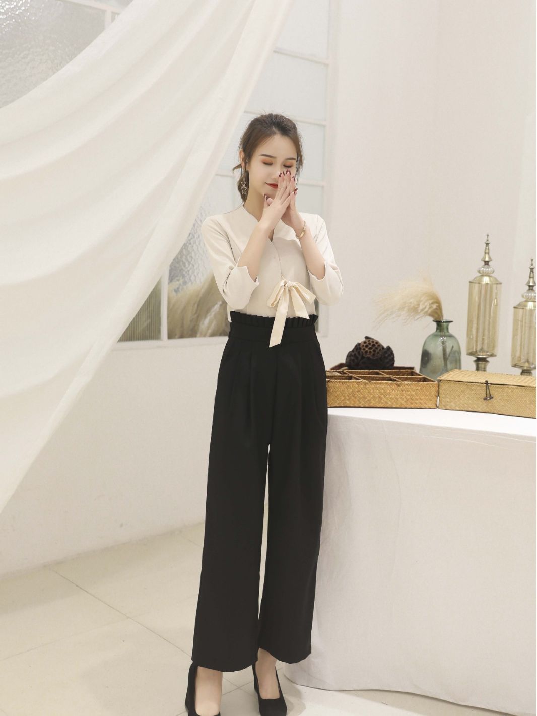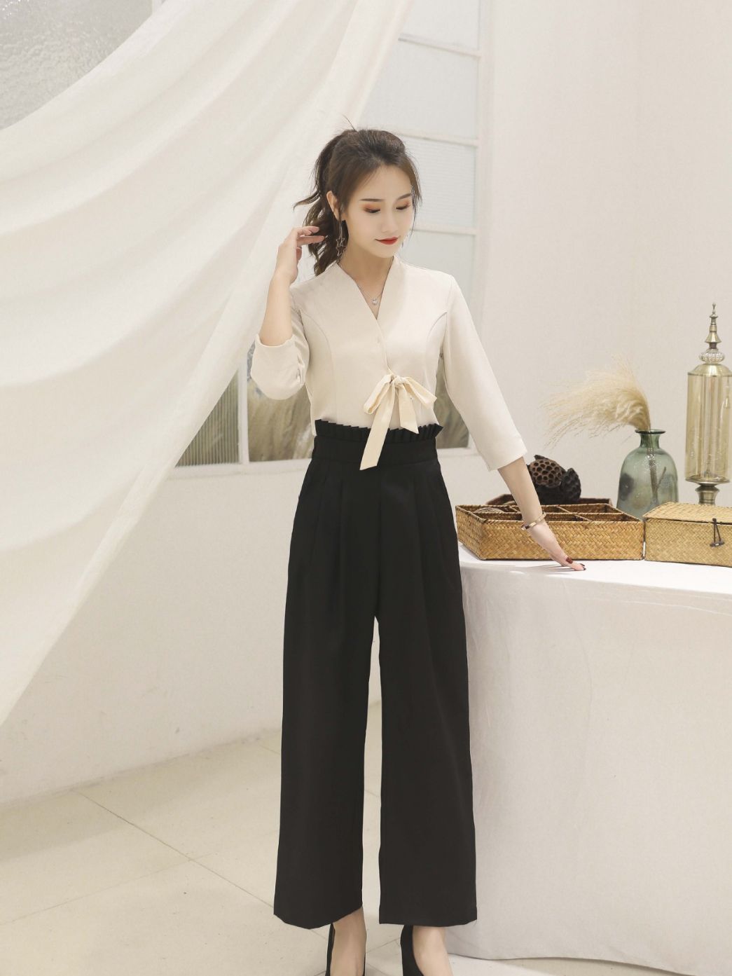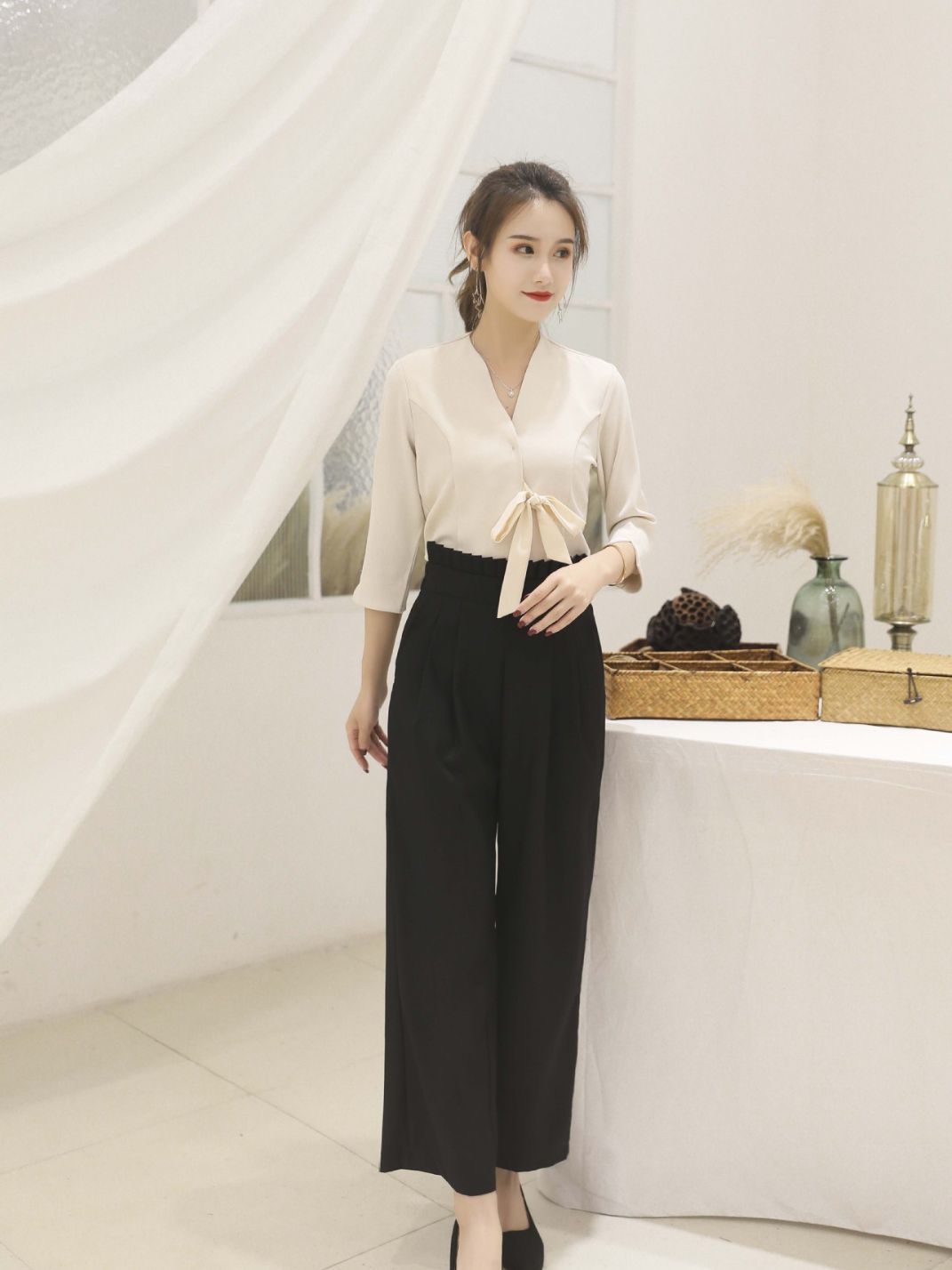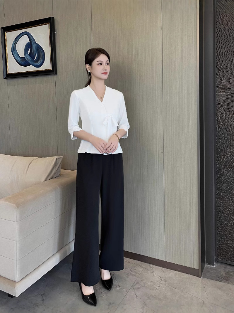 Абрикос с короткими рукавами + черные брюки; Белый с короткими рукавами + черные брюки; Семиконечные рукава абрикос + черные брюки; Семиточечный рукав Белый + черные брюки; Один топ с семью рукавами белый; Один топ с короткими рукавами белый; Одиночные штаны