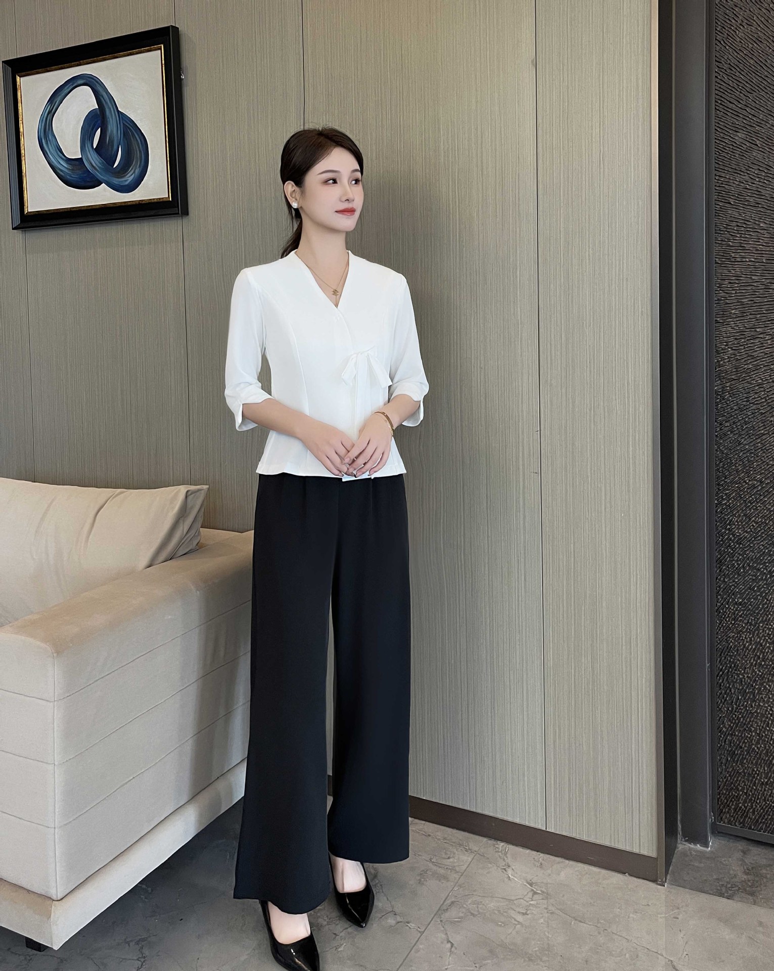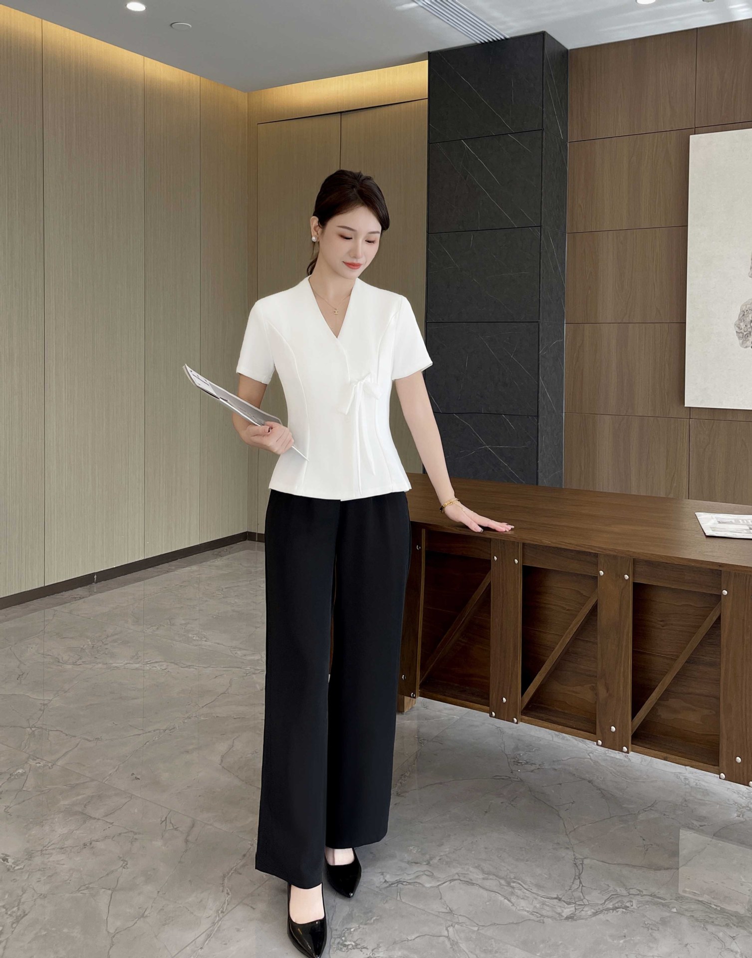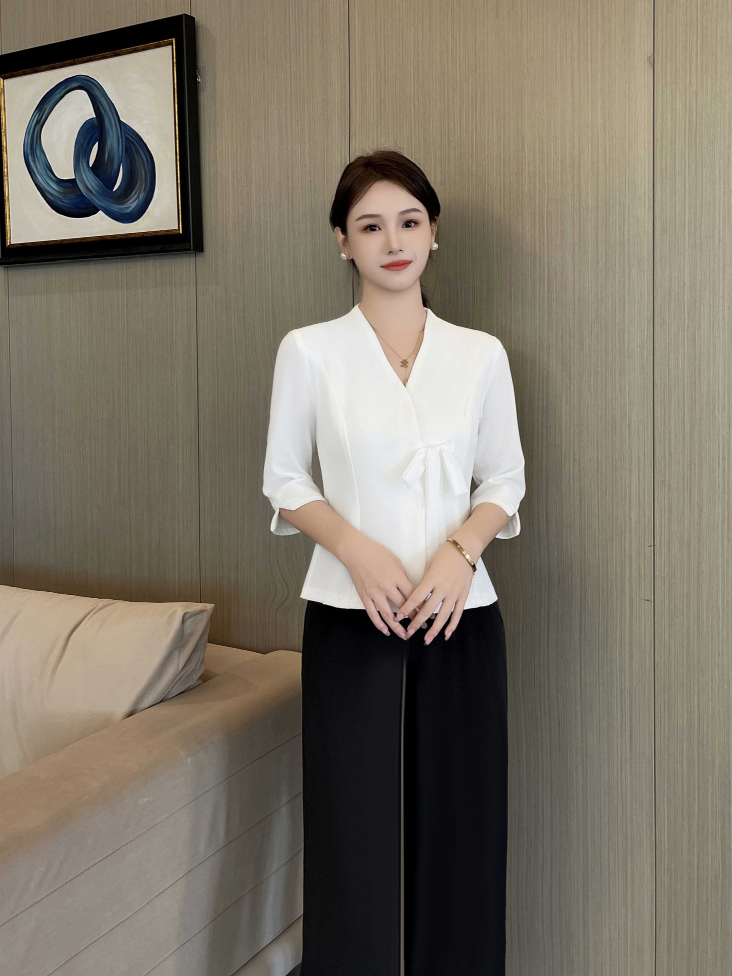 Абрикос с короткими рукавами + черные брюки; Белый с короткими рукавами + черные брюки; Семиконечные рукава абрикос + черные брюки; Семиточечный рукав Белый + черные брюки; Один топ с семью рукавами белый; Один топ с короткими рукавами белый; Одиночные штаны
