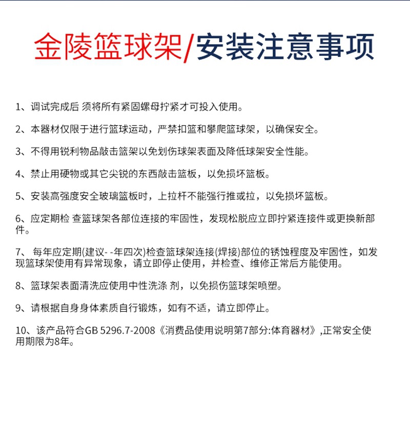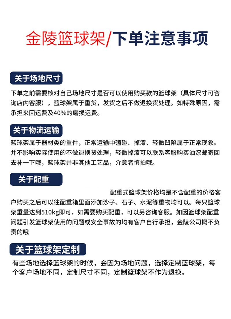 篮球架由于是大件物品,一般正常运输不会有磕碰。若物流途中出现小的磕碰、掉漆、等不完美的地方并不影响使用,篮球架属于大件重货,非精美工艺品,介意者慎拍.安装时自行按说明书要求自备黄沙石子,篮球架自配重(室内球架除外)必须达到每个510KG方可使用,如因篮球架配重问题引发的篮球架使用问题或安全事故的均由客户自行承担,金陵公司概不负责。(如需金陵专业配重需自费400元一个篮球架的配重510kg,运费到付。)