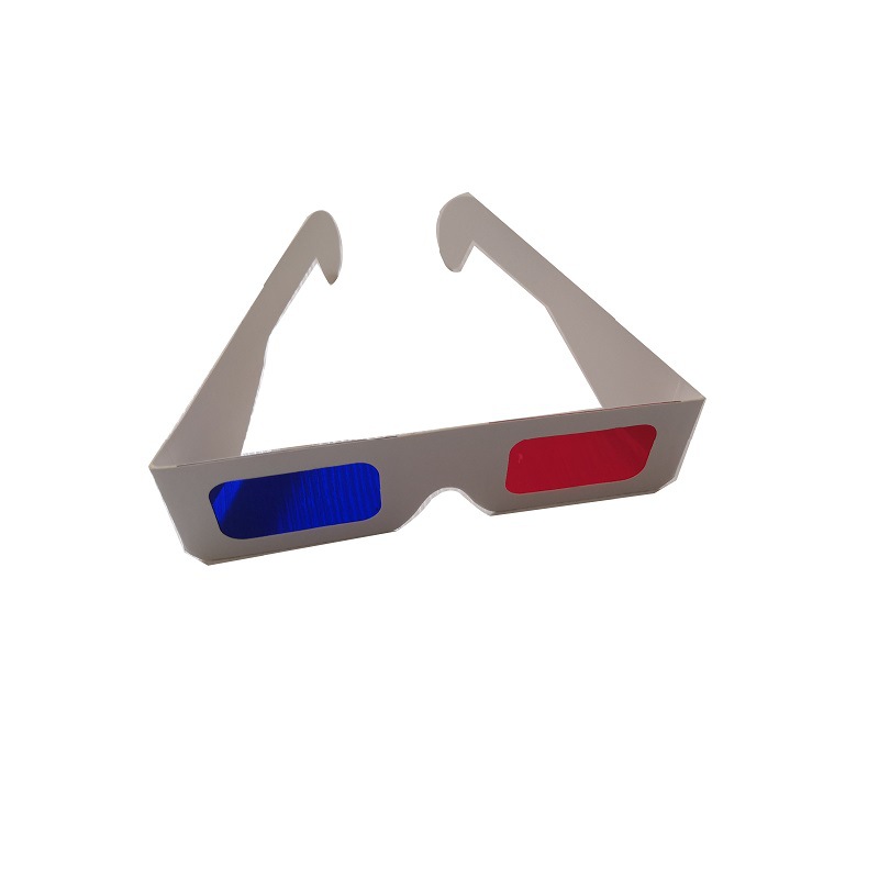 - 此款3D眼镜,属于互补色红蓝3D眼镜,标准说法镜片为红青镜片(英文red & cyan), 国内通用说法为红蓝眼镜,采用强度好的双层250克白卡纸为眼镜框,环保胶水处理,镜片为16丝PET镜片,过滤效果好,3D效果明显。