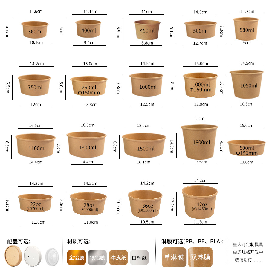 Миска из крафт-бумаги (без крышки) - пожалуйста, свяжитесь со службой поддержки клиентов, чтобы узнать стоимость доставки.; Внутренний лоток из полипропилена (без чаши и крышки); Белая бумажная крышка (чаша в комплект не входит); Пластиковая крышка из полипропилена (чаша в комплект не входит); Крышка чаши из ПЭТ (чаша в комплект не входит); Крышка из крафт-бумаги (чаша в комплект не входит); Белая бумажная миска (без крышки)