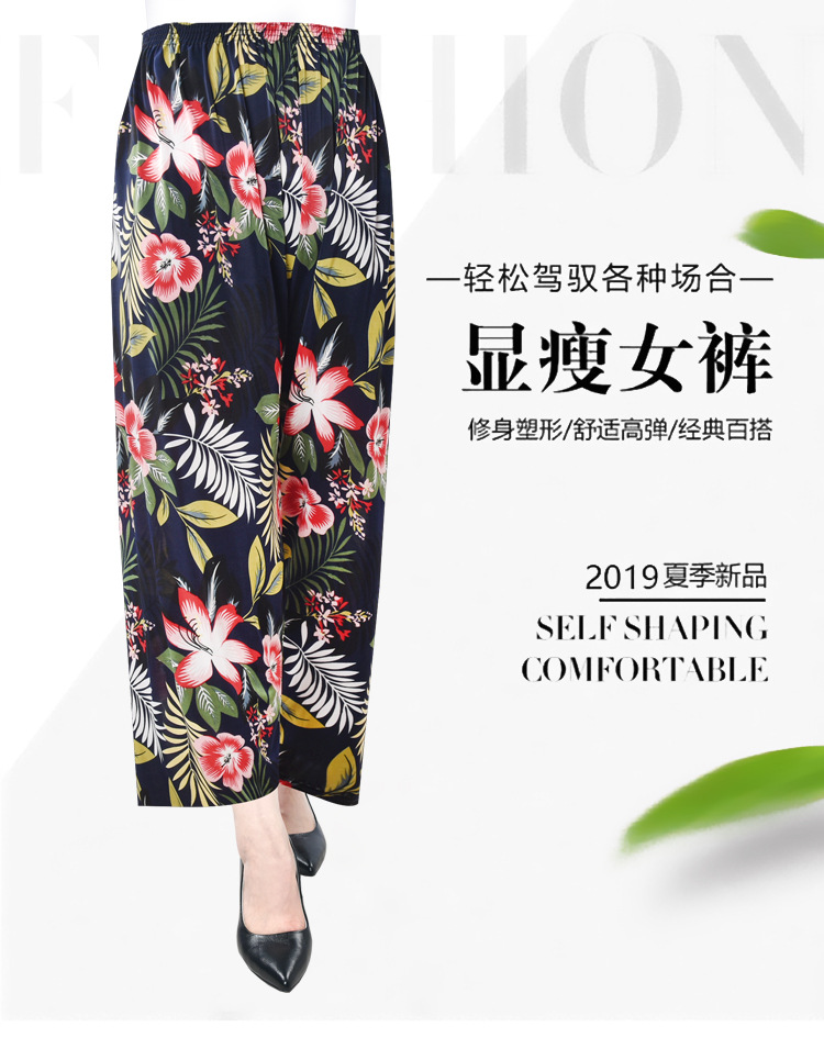 Прямые поставки с фабрики: летние прохладные брюки из ледяного шелка с цветочным принтом для женщин, укороченные брюки с цветочным узором, повседневный комплект брюк для женщин среднего и старшего возраста, визуально удлиняют ноги.