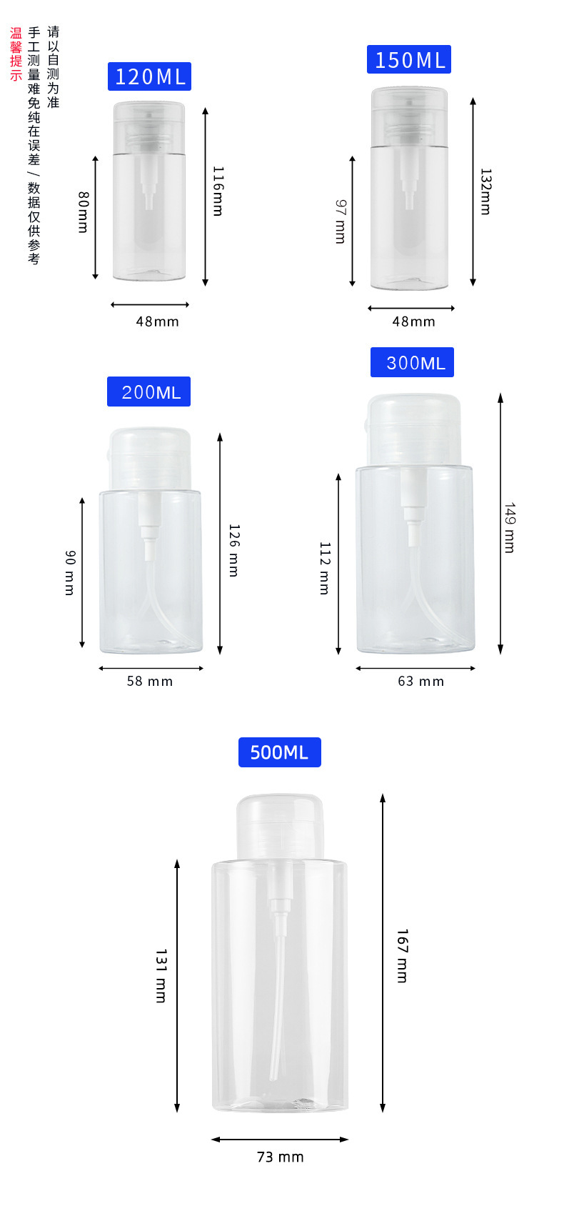 200ml; 150ml; 300ml; 120ml; 60ml; 80ml; 100ml; 500ml