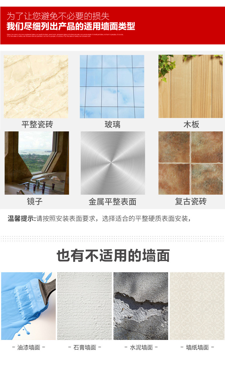 (2)免打孔安装请注意,墙面需平整坚固的玻璃瓷砖等。不可用在粉刷墙,墙纸,石灰墙等不平整不坚固的墙面上。涂胶上墙后需等待3-5天,免钉胶完全干透再使用!