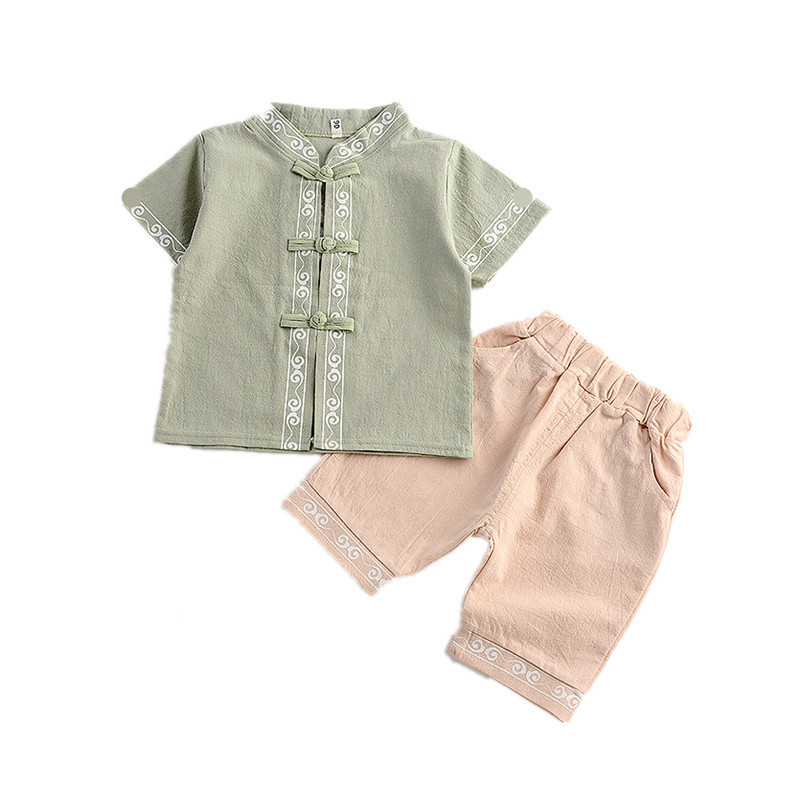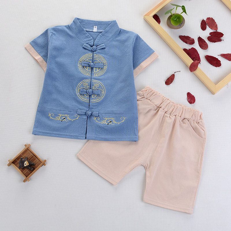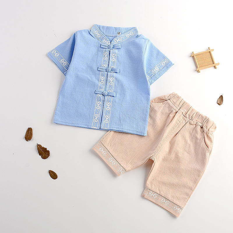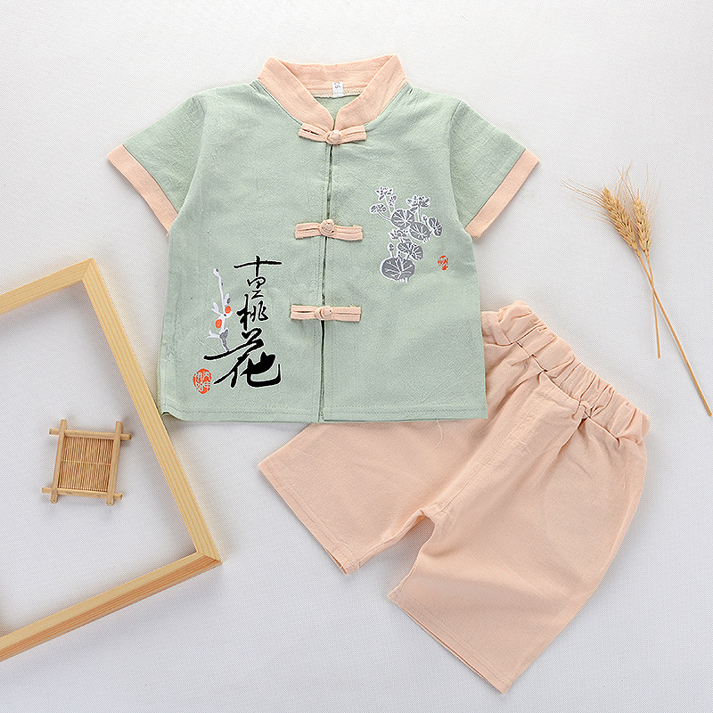 Детский костюм Ханьфу для мальчиков из хлопка и льна, летний китайский этнический стиль, ретро-костюм Тан с короткими рукавами для малышей и детей младшего возраста