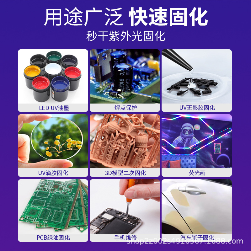 【使用方法】LED紫外线灯要求尽量贴近固化物件表面,距离越近越好,最好保持在0.5-1厘米距离以内,太远的照射距离会严重影响固化效果;