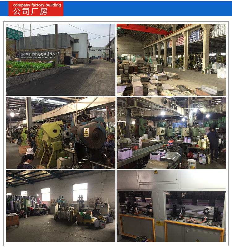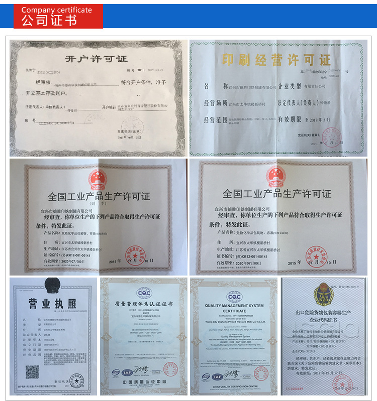 本公司具有二十多年印铁制罐的历史,并拥有进口印铁生产流水线,以及全自动制罐生产线。公司占地面积3万多平方米,拥有固定资产3000多万元,是具有一定技术实力的源头工厂。企业通过ISO9001:2000国际质量体系的认证,获得《全国工业产品生产许可证》、并通过江苏省出入境检验疫局测试和认证,拥有《出口危险货物包装容器质量许可证》适用于出口危险品的包装。本公司生产的产品远销中国各地,深受广大用户喜欢。