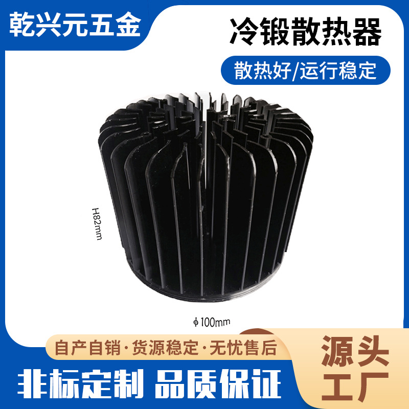 a、冷挤压散热器材质为1070纯铝,导热系数为226m.k,叶片可以做到0.8厚,增加产品热辐射表面积;同样体积形状的一体式散热器,可用于更大功率产品的散热,而重量更轻,节省更多运输成本