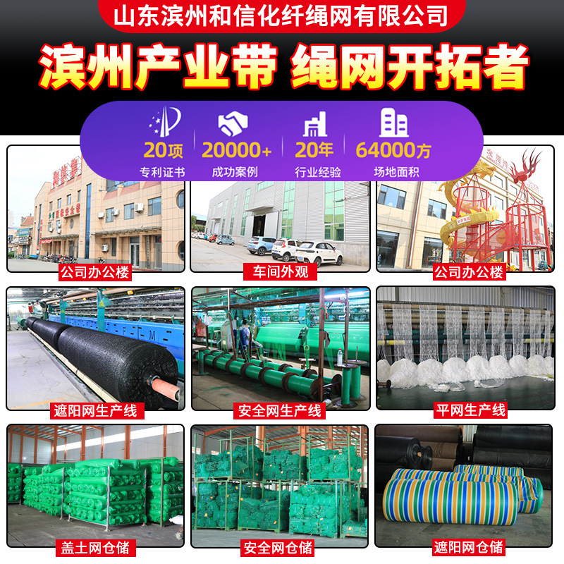 山东滨州和信化纤绳网有限公司,建于一九九三年,坐落于物华天宝、人杰地灵的鲁北平原、孙子故里、绳网之乡、绳网产品重要集散中心----惠民县李庄镇(位于济南至滨州220国道中段)。本公司绳网产品产销历史悠久,有中华人民共和国质量技术监督局颁发的工业产品生产许可证和国家安全生产监督管理局颁发的国家特种劳动防护用品安全标志证书,是该区域获得国家特种劳动防护用品定点生产的企业。