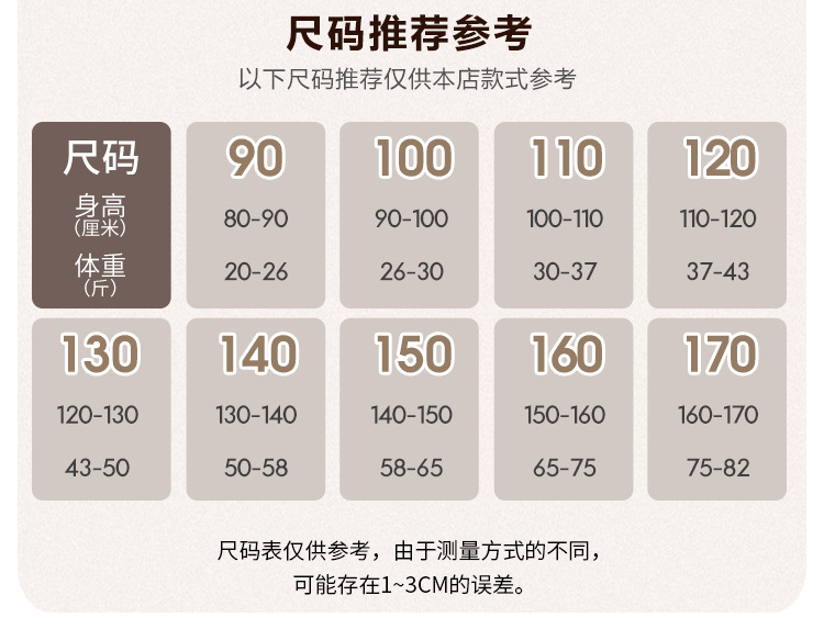 90cm; 100cm; 110cm; 120cm; 130cm; 140cm; 150cm; 160cm; 170cm