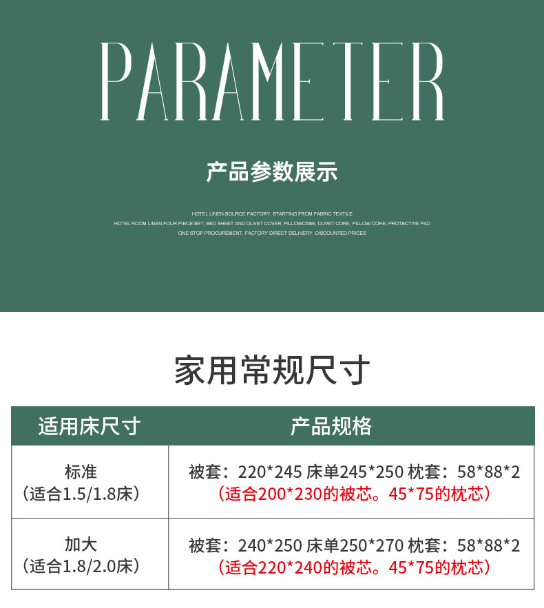 Гостиничный Комплект из трех частей с кроватью 1 м (подходит для стеганого одеяла 150x200); Гостиничный Комплект из трех предметов с кроватью 1,2 м (подходит для стеганого одеяла 160x220); Комплект из трех частей кровати отеля 1,35 м (подходит для стеганого одеяла 180x220); Комплект постельного белья 1,5 м для отеля из четырех частей (подходит для стеганого одеяла 190X220); Гостиничный комплект из четырех предметов 1,8 м (подходит для стеганого одеяла 220X220); Комплект постельного белья для отеля 2,0 м из четырех частей (подходит для стеганого одеяла 240x230); Бытовая кровать 1,5/1,8 м (подходит для стеганого одеяла 200*230); Бытовая кровать 1,8/2,0 м (подходит для стеганого одеяла 220*240)