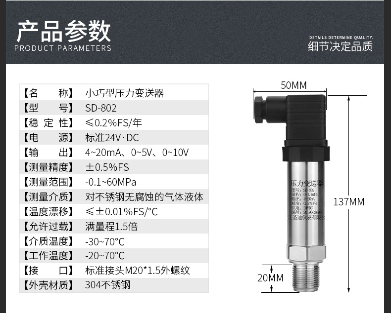 Производитель поставляет компактный промышленный датчик давления SD-802 из нержавеющей стали с диффузным кремниевым датчиком давления.