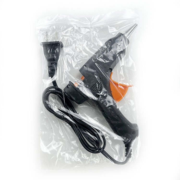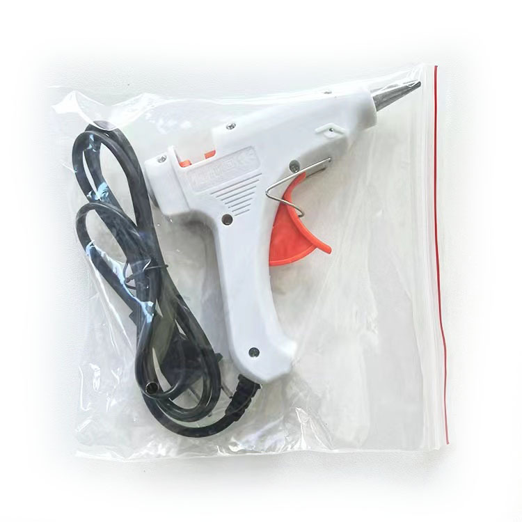 2、将胶条从胶枪尾插入,送至枪管内,插上电源预热5-8分钟后。扣动扳机即能挤出溶胶,并且可控制出胶量。