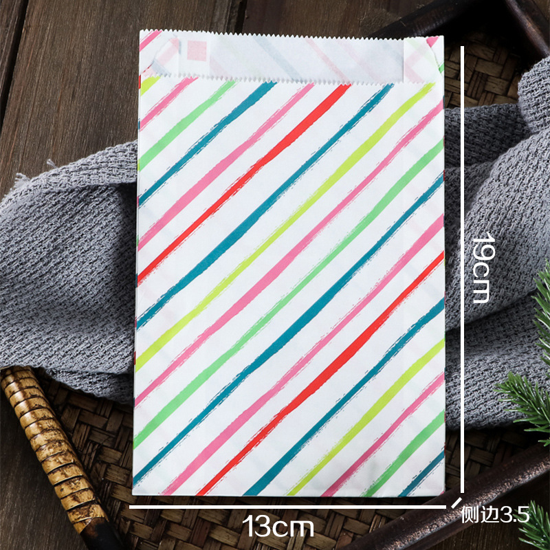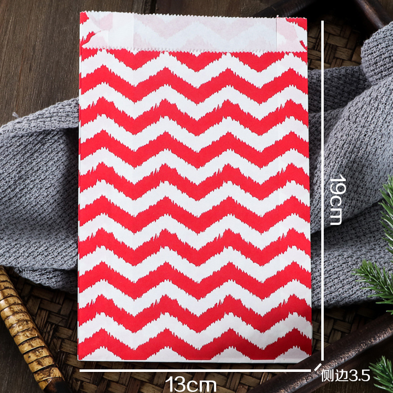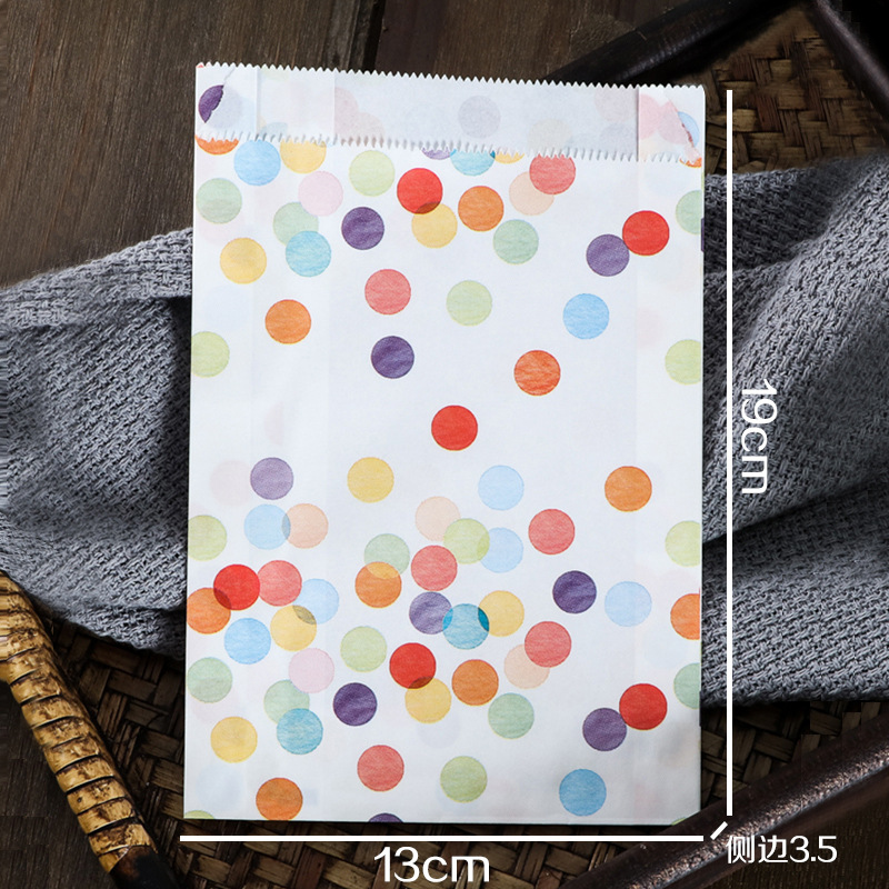 Маслостойкий пакет с точечным рисунком 19*13*3,5 см; бумага; Красный гофрированный маслостойкий пакет 19*13*3,5 см; бумага; Цветной диагональный маслостойкий пакет 19*13*3,5 см; бумага; 10 штук круглых наклеек из коровьей кожи; бумага