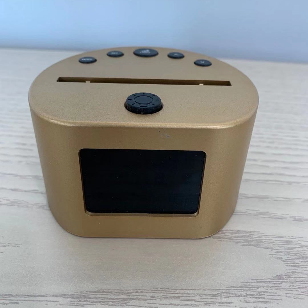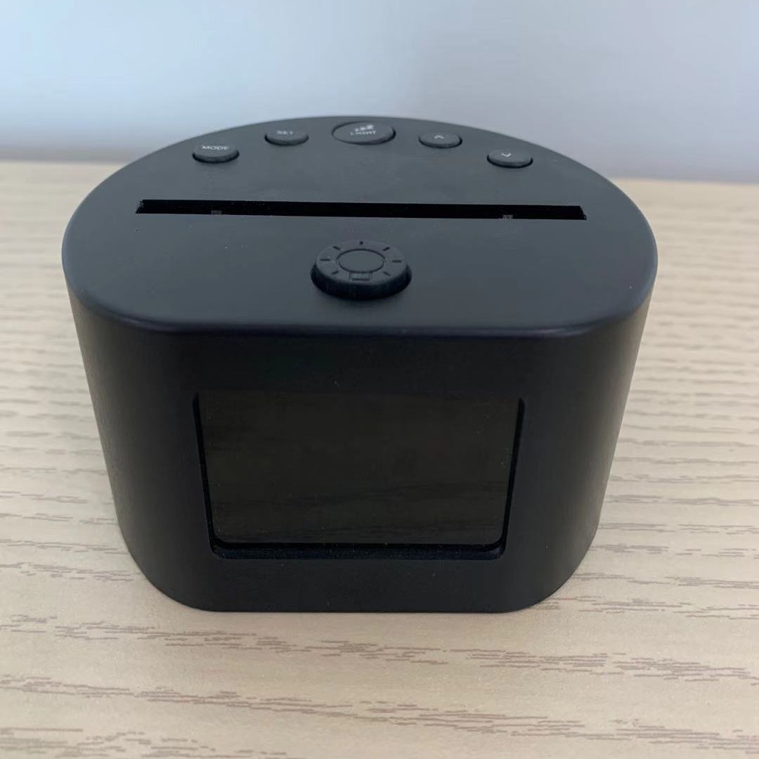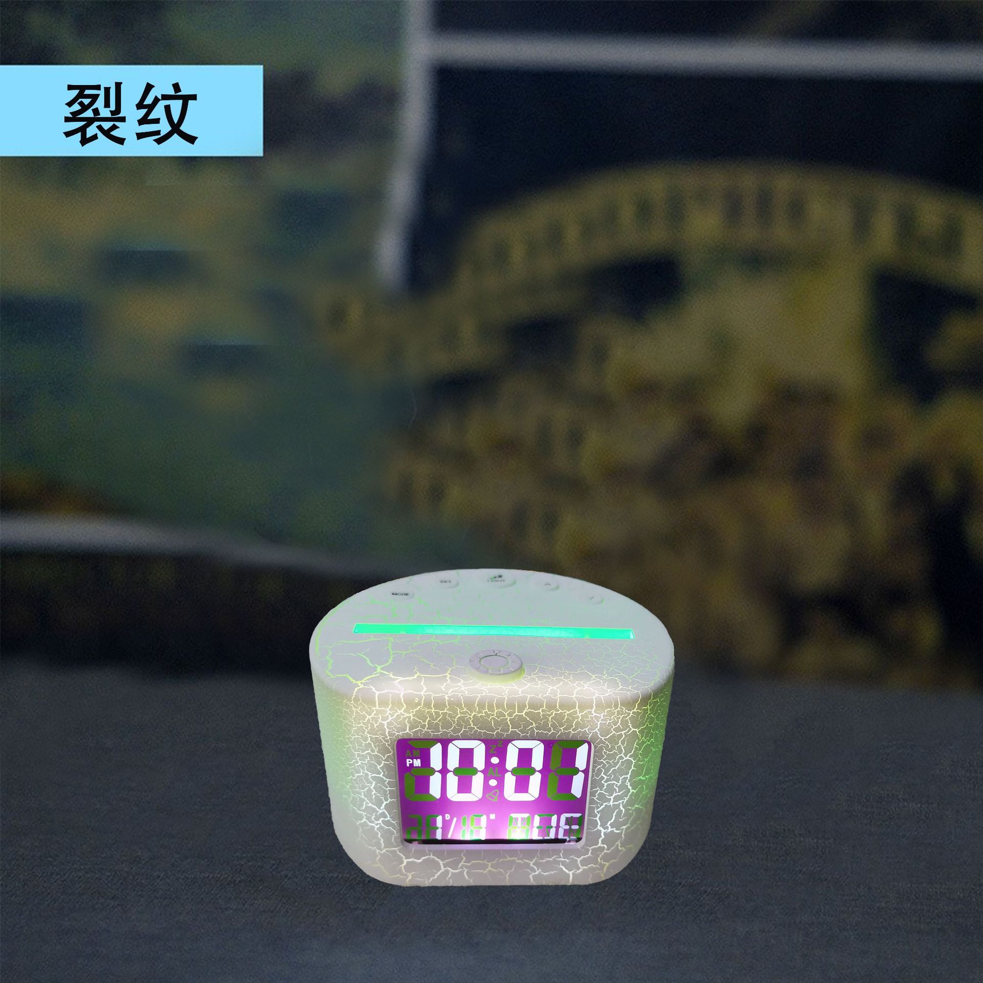 产品功能:图案七彩变光,时间日期万年历显示,1组闹钟,9种铃声,贪睡功能,屏幕背光
