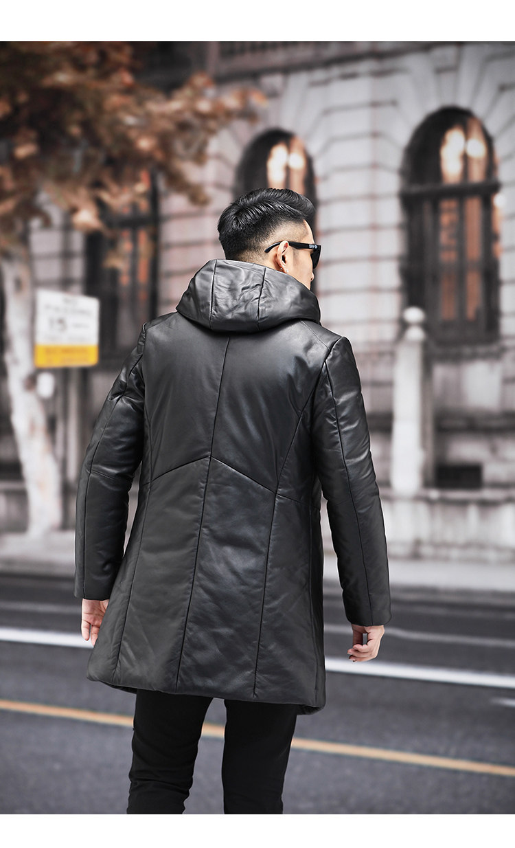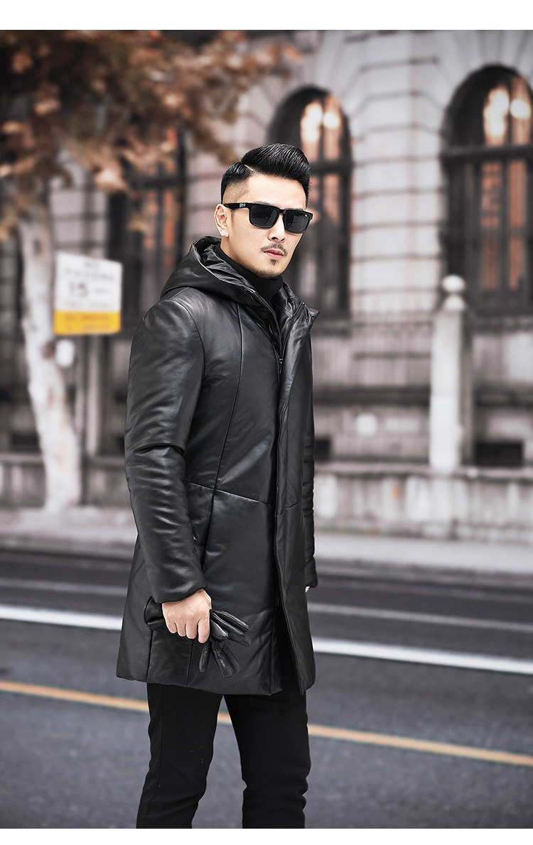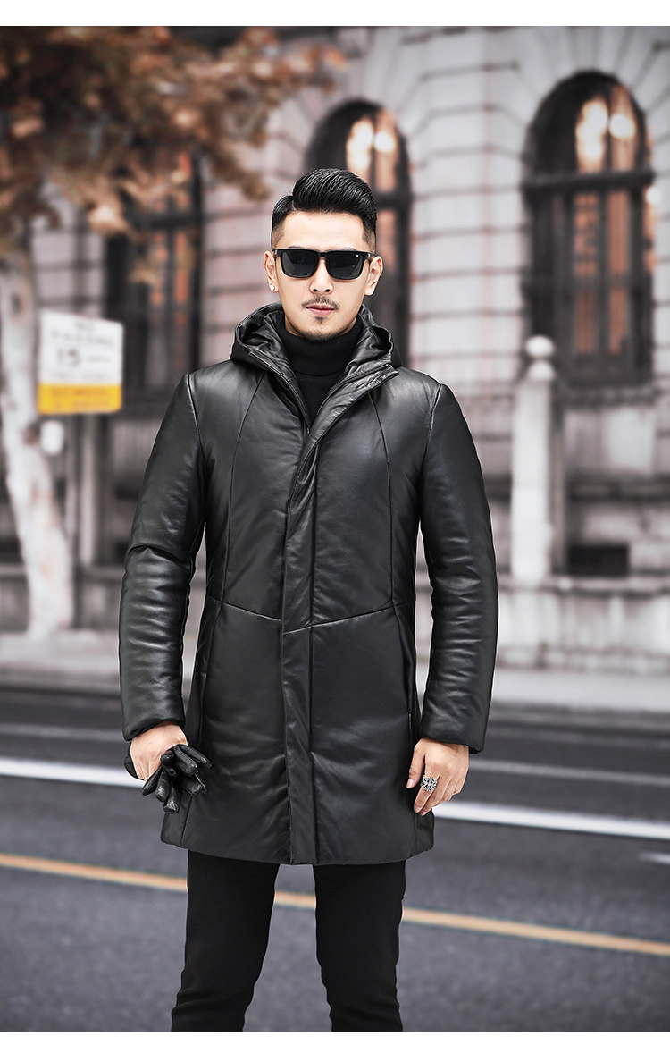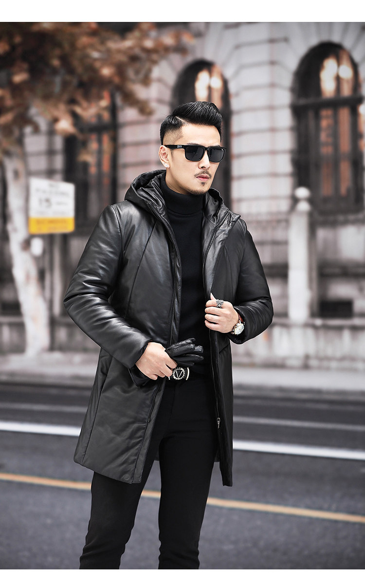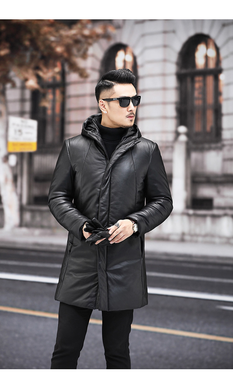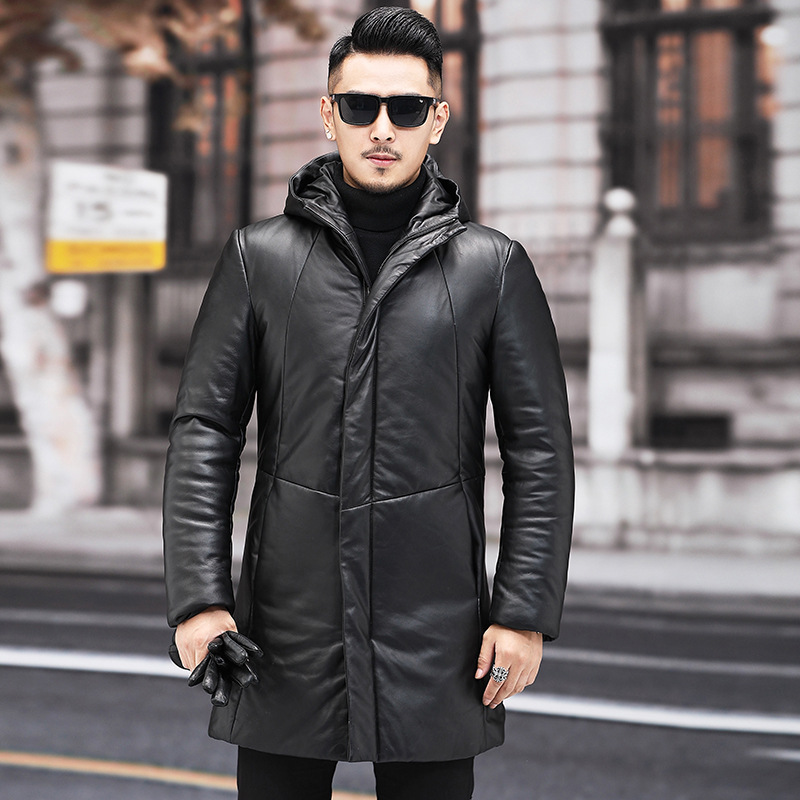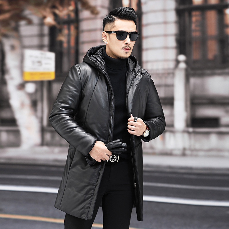 Мужской пуховик с капюшоном из натуральной кожи Haining, Молодежный модный приталенный зимний Плотный кожаный пуховик средней длины в Корейском стиле