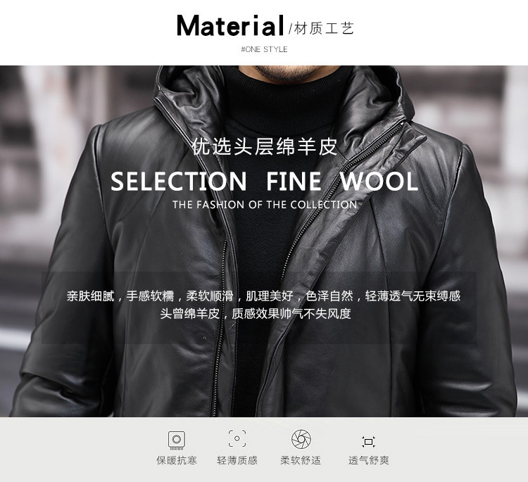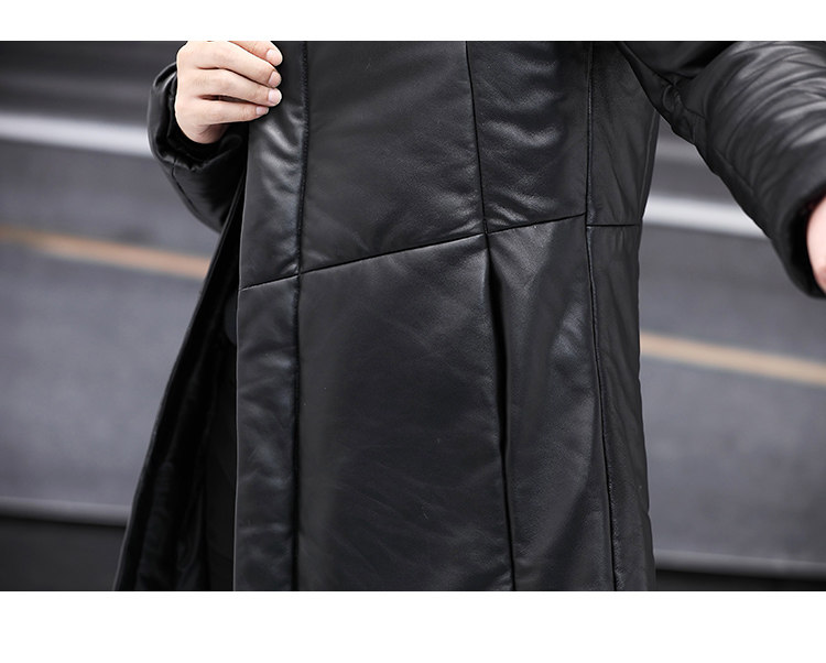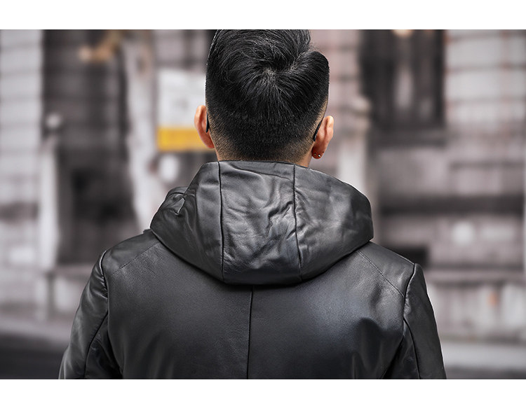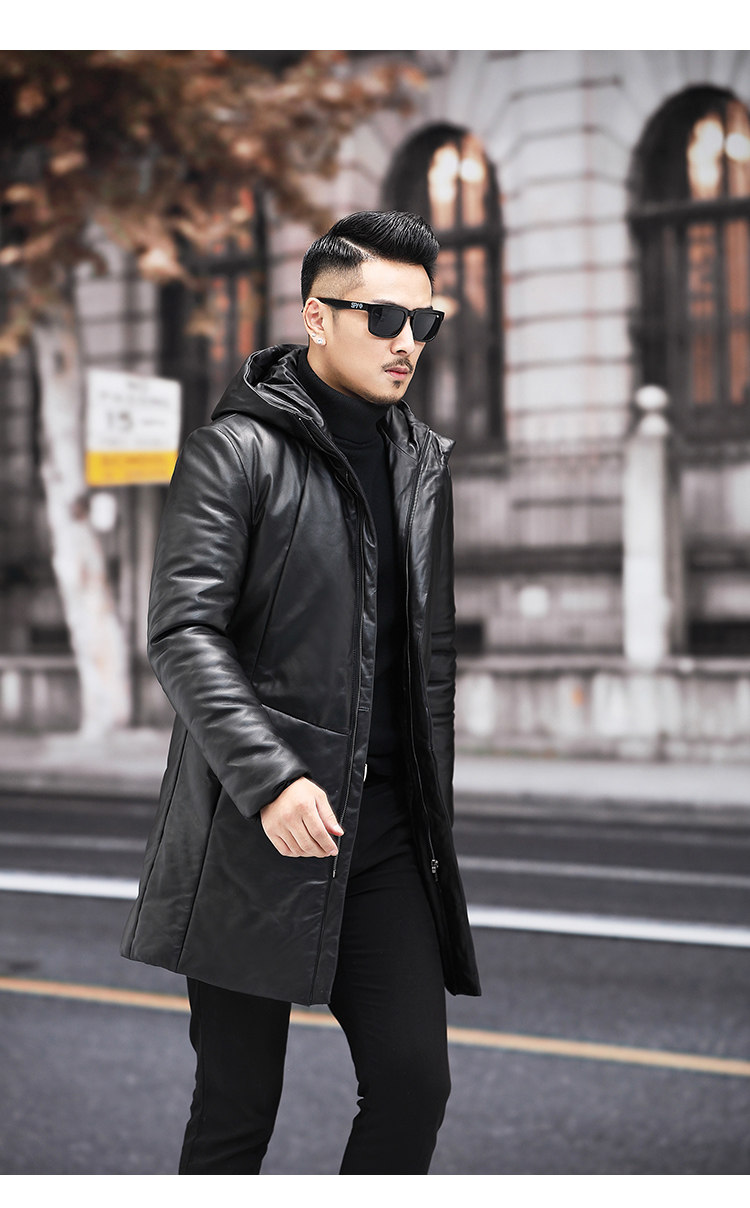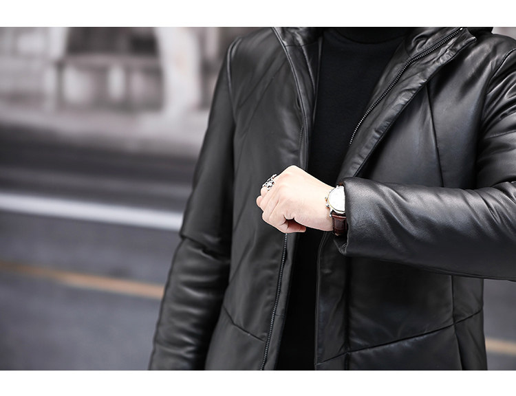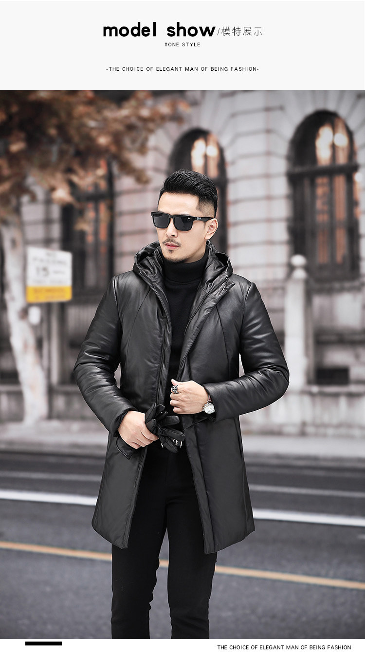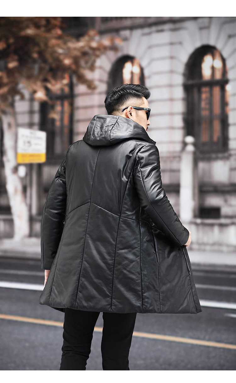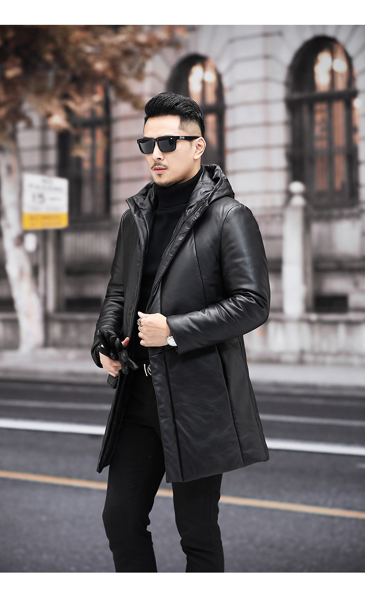 Мужской пуховик с капюшоном из натуральной кожи Haining, Молодежный модный приталенный зимний Плотный кожаный пуховик средней длины в Корейском стиле