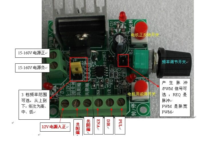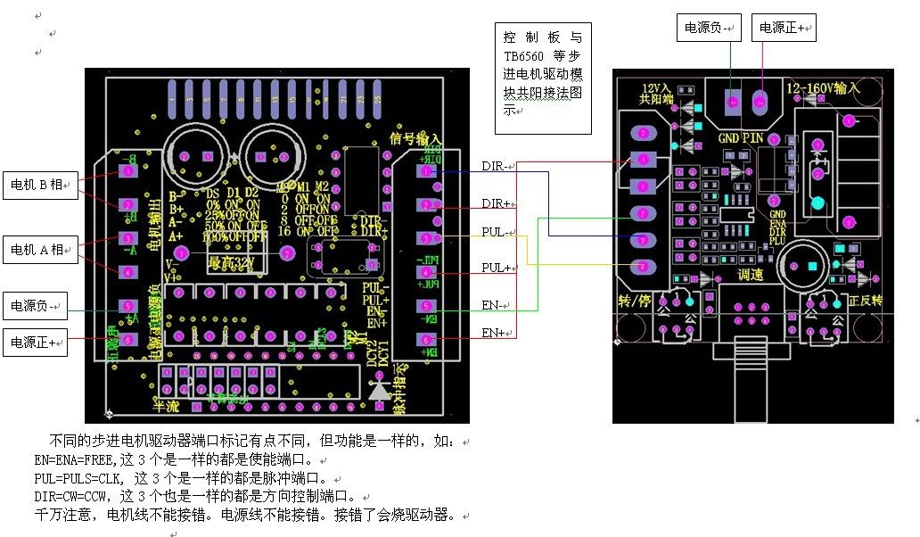 2、PUL+和PUL-是脉冲的正和负;EN+和EN-是使能端的正和负;DIR+和DIR-是方向的正和负。将这6条线分别接去驱动器对应脉冲、方向、使能的6个端口。注意,如果要用到开或停的功能,控制器上的ENA使能端一定要共阴或共阳接到驱动器