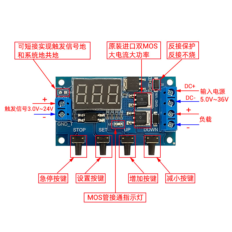 2、触发信号源:高电平触发(DC 3.0V—24V)信号地与系统地不共地提高系统的抗干扰能力(也可自行短接共地)