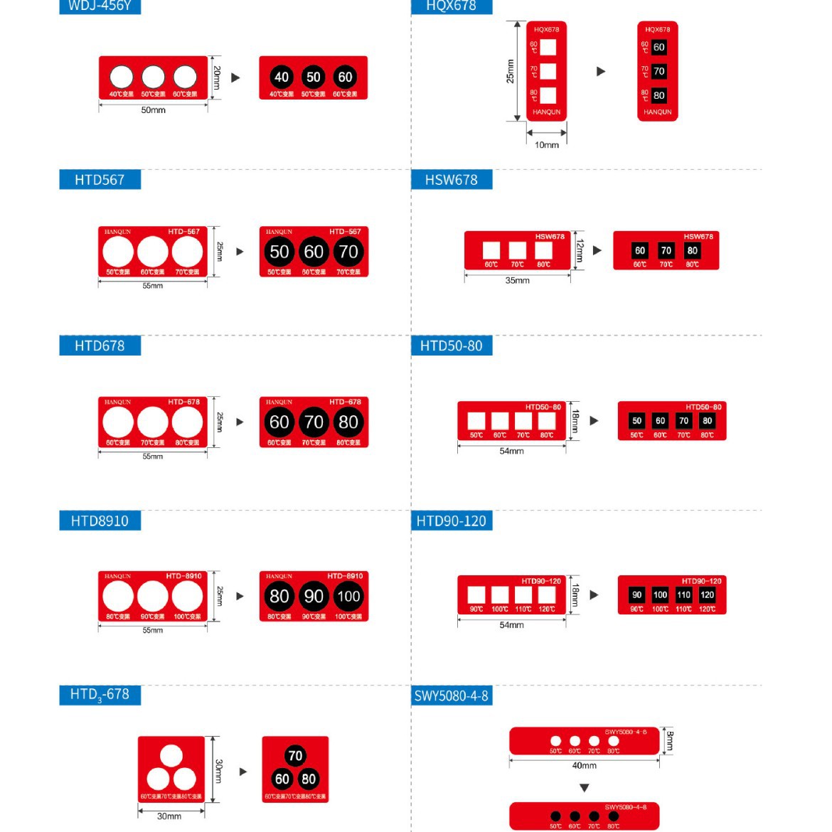 2.使用时如要知道监测部位温度逐渐上升的情况,可粘贴两片以上不同额定温度的变色测温贴片,亦可使用HTD-678型等(每片中含多种额定温度)贴片。