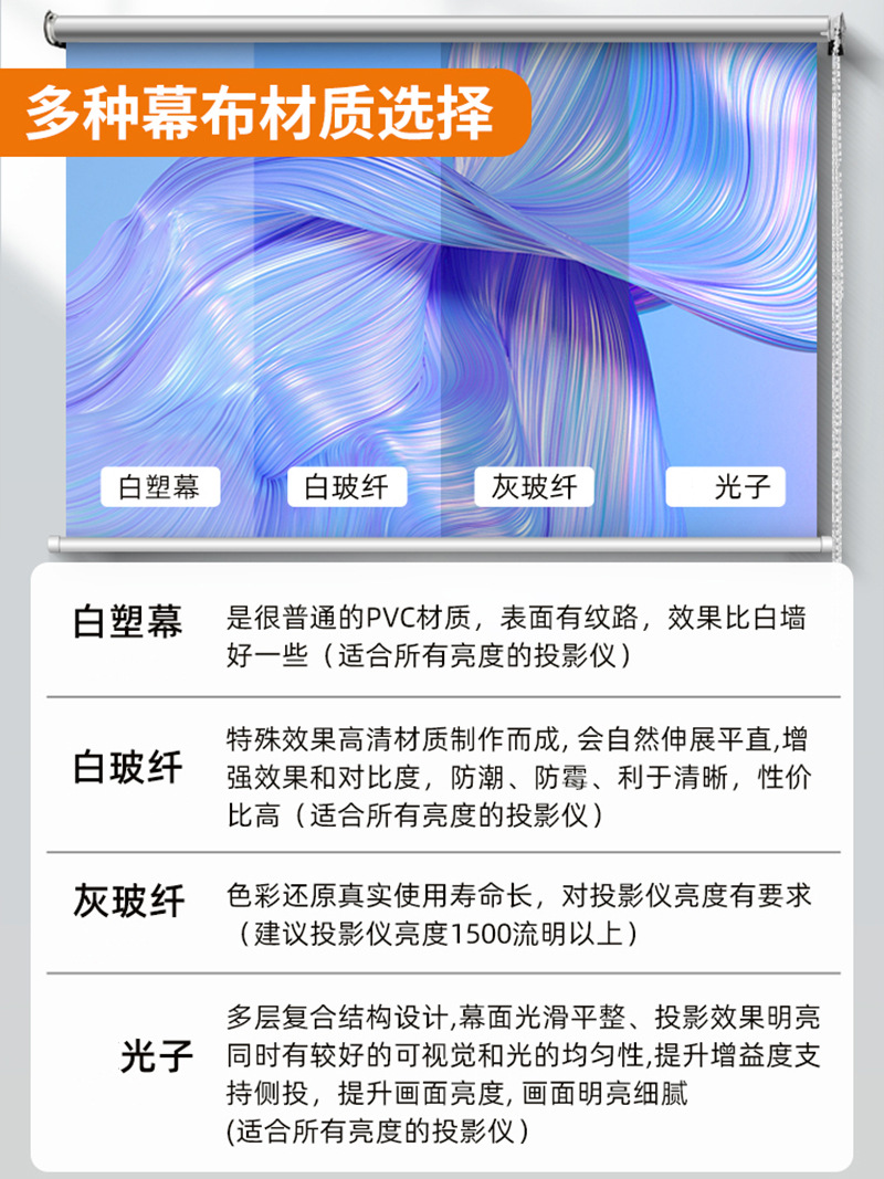 Белый пластик (60 дюймов 4:3); Белый пластик (60 дюймов 16:9); Белый пластик (72 дюйма 4:3); Белый пластик (72 дюйма 16:9); Белый пластик (84 дюйма 4:3); Белый пластик (84 дюйма 16:9); Белый пластик (100 дюймов 4:3); Белый пластик (100 дюймов 16:9); Белый пластик (120 дюймов 4:3); Белый пластик (120 дюймов 16:9); Белый пластик (150 дюймов 4:3); Белый пластик (150 дюймов 16:9); Утолщенное белое стекловолокно (рекомендуется) (60 дюймов 4:3); Утолщенное белое стекловолокно (рекомендуется) (60 дюймов, 16:9); Утолщенное белое стекловолокно (рекомендуется) (72 дюйма 4:3); Утолщенное белое стекловолокно (рекомендуется) (72 дюйма, 16:9); Утолщенное белое стекловолокно (рекомендуется) (84 дюйма 4:3); Утолщенное белое стекловолокно (рекомендуется) (84 дюйма, 16:9); Утолщенное белое стекловолокно (рекомендуется) (100 дюймов 4:3); Утолщенное белое стекловолокно (рекомендуется) (100 дюймов, 16:9); Утолщенное белое стекловолокно (рекомендуется) (120 дюймов 4:3); Утолщенное белое стекловолокно (рекомендуется) (120 дюймов, 16:9); Утолщенное белое стекловолокно (рекомендуется) (150 дюймов 4:3); Утолщенное белое стекловолокно (рекомендуется) (150 дюймов, 16:9); Фотон (60 дюймов 4:3); Фотон (60 дюймов 16:9); Фотон (72 дюйма 4:3); Фотон (72 дюйма 16:9); Фотон (84 дюйма 4:3); Фотон (84 дюйма 16:9); Фотон (100 дюймов 4:3); Фотон (100 дюймов 16:9); Фотон (120 дюймов 4:3); Фотон (120 дюймов 16:9); Фотон (150 дюймов 4:3); Фотон (150 дюймов 16:9); Серый антибликовый экран из стекловолокна (60 дюймов, соотношение сторон 4:3); Серый антибликовый экран из стекловолокна (60 дюймов, 16:9); Серый антибликовый экран из стекловолокна (72 дюйма, соотношение сторон 4:3); Серый антибликовый экран из стекловолокна (72 дюйма, 16:9); Серый антибликовый экран из стекловолокна (84 дюйма, соотношение сторон 4:3); Серый антибликовый экран из стекловолокна (84 дюйма, 16:9); Серый антибликовый экран из стекловолокна (100 дюймов, соотношение сторон 4:3); Серый антибликовый экран из стекловолокна (100 дюймов, соотношение сторон 16:9); Серый антибликовый экран из стекловолокна (120 дюймов, соотношение сторон 4:3); Серый антибликовый экран из стекловолокна (120 дюймов, 16:9); Серый антибликовый экран из стекловолокна (150 дюймов, соотношение сторон 4:3); Серый антибликовый экран из стекловолокна (150 дюймов, соотношение сторон 16:9)
