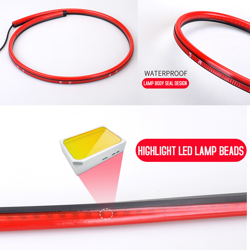 多模式:1:示宽灯不开启 (白天模式) 灯带不亮光,放开刹车后灯带不亮 。2:示宽灯开启(夜晚模式1)灯带开启跑马模式约8秒后,呈常亮红光。 3:示宽灯开启(夜晚模式2)踩下刹车后1秒流光,然后高亮红光,放开刹车后2秒流光,然后红光常亮