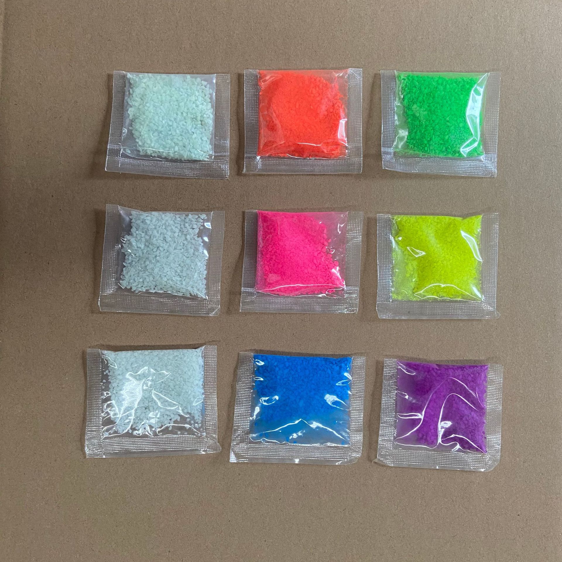 10 г * желто-зеленый свет; 10 г* сине-зеленый свет; 10 г * небесно-голубой свет; 10 г*синий; 10 г*фиолетовый; 10 г*зеленый; 10 г*жёлтый; 10 г*розовый; 10 г*оранжево-красный; 10 г*апельсин