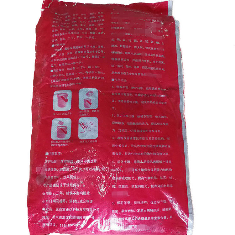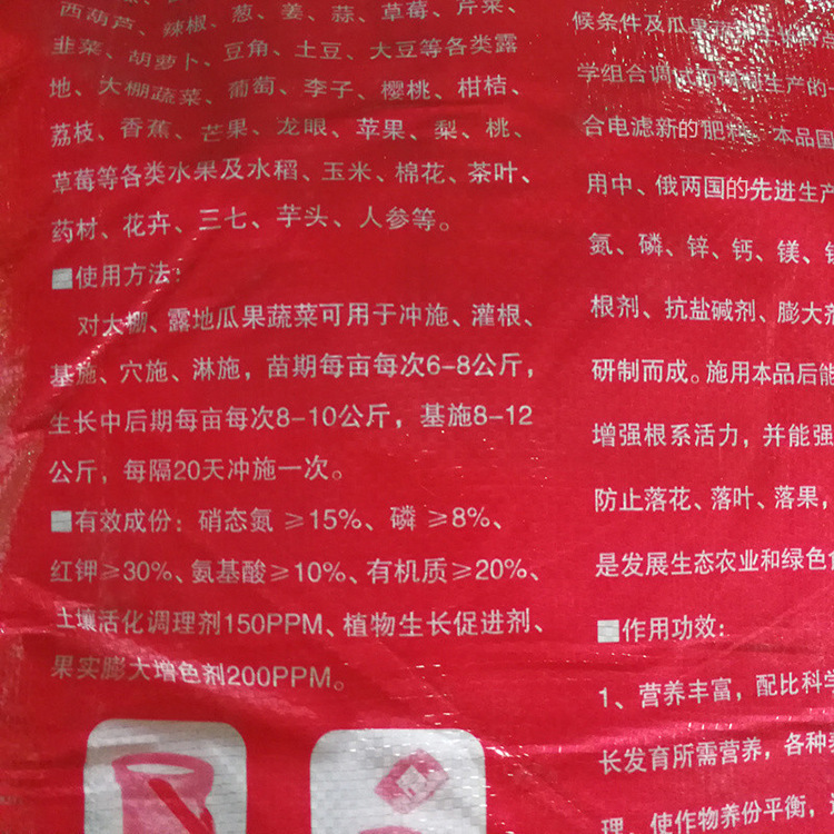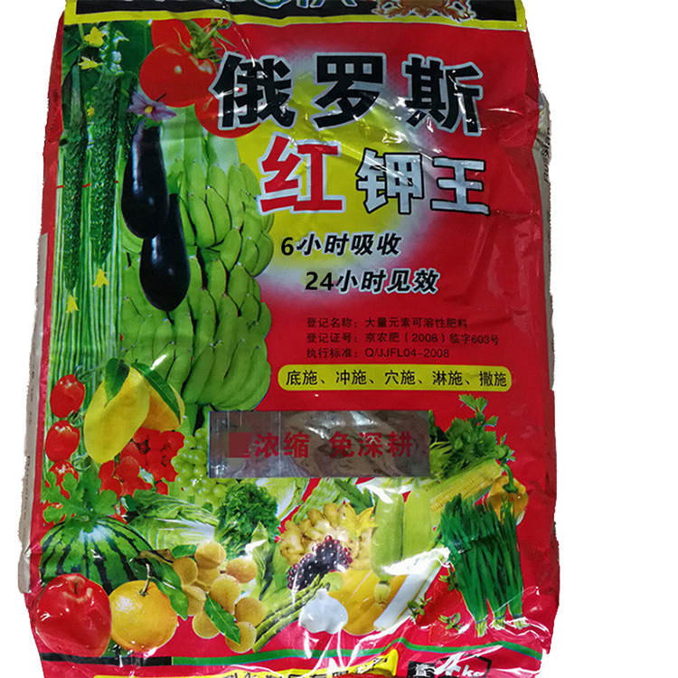 产品说明和特点:本肥料以俄罗斯钾肥为原料,采用水盐体系工艺生产电滤提纯。红色小颗粒,水溶快,无残渣,不含氯,不结块,使用安全,肥效又快又长。适合大部分作物使用,尤其适合瓜果、果树、蔬菜、中药材、花卉、茶叶等使用。肥料除含有大量元素氮、磷、钾外,还含有氨基酸、有机质、果实膨大增色剂、微量元素等成分。作物使用后根系发达,茎秆粗壮,叶片浓绿,保花保果,增甜增色,果实膨大快,色泽好,口感好,卖相好,产量高。本品叶面亲和性好,撒施不烧叶,叶面喷施同样安全,肥料性价比高。