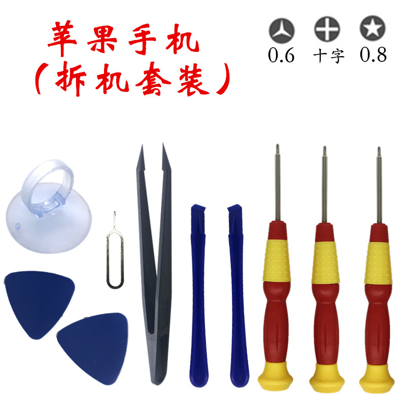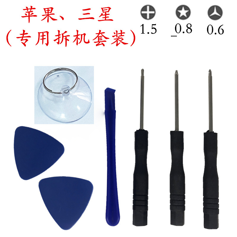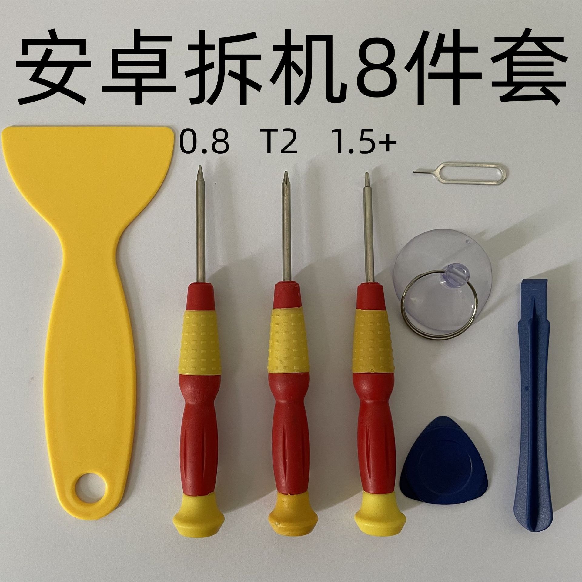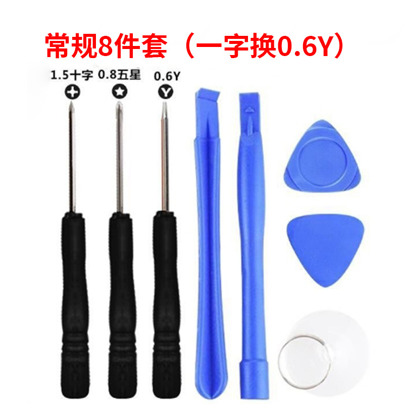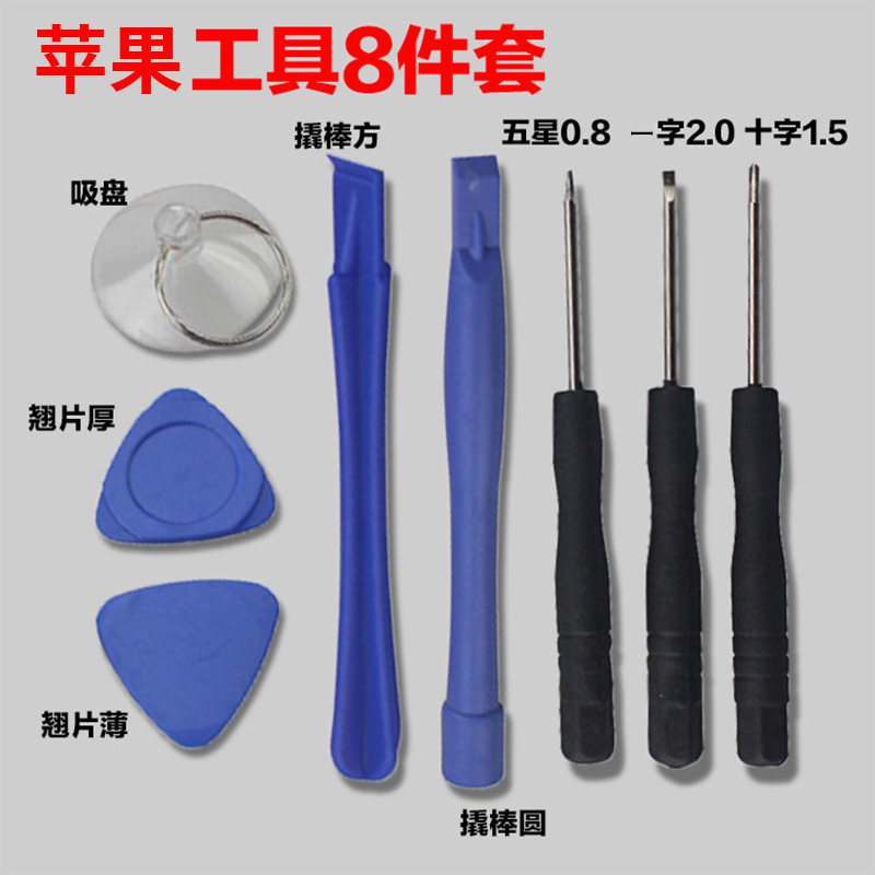 商品型号:一共8件,分别是0.8五星螺丝刀,十字螺丝刀,一字螺丝刀,两个拆机片,吸盘和两根拆机棒,带封口袋包装,拆机齐全的一套工具买家收货温馨提示: