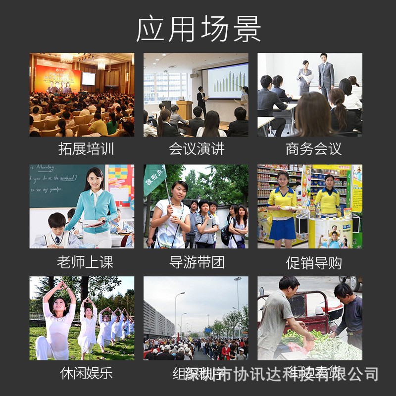 尊敬的客户,您好!感谢光临本公司深圳市协讯达科技有限公司,我司从事专业做扩音器头戴麦克风系列产品。在教学,演讲,卖场促销,导游喊话,微型电台,唱戏应用非常广泛。与传统的有线手持麦克风相比,携带更方便,音质更清晰!且本公司郑重承诺,凡在我司购买任何系列产品实行终生免费保修或不良更换。