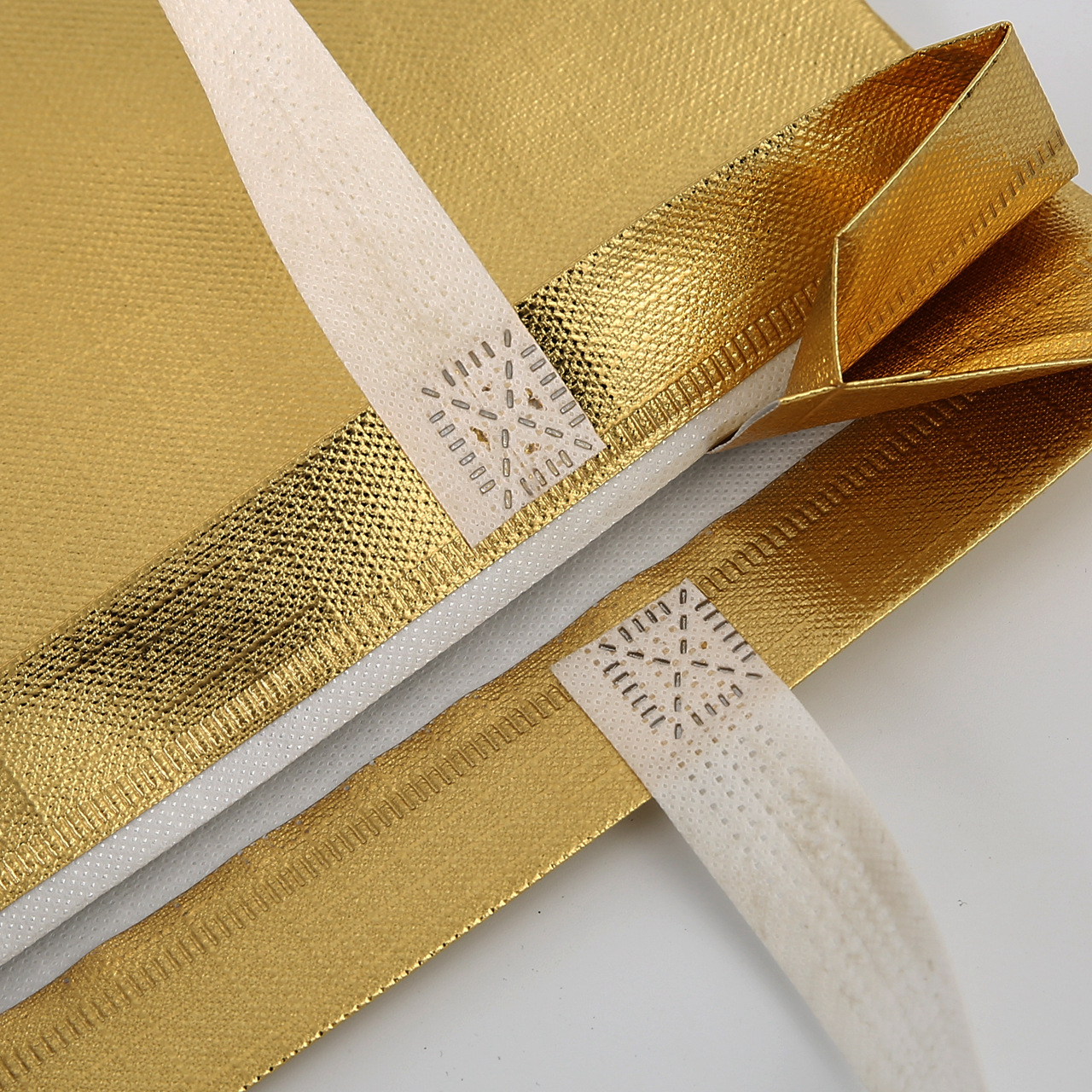 Покрытие нетканые мешки для рекламы Сумка для покупок Универсальный позолоченный мешок для упаковки подарков с логотипом