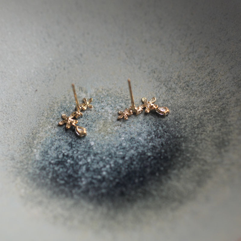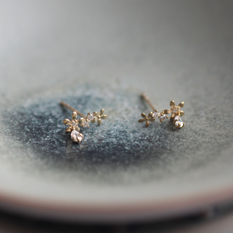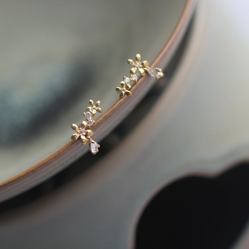 Серьги в японском и корейском стиле, миниатюрные, с двумя цветами-каплями, из чистого золота 9К, инкрустированные цирконами, 499OK