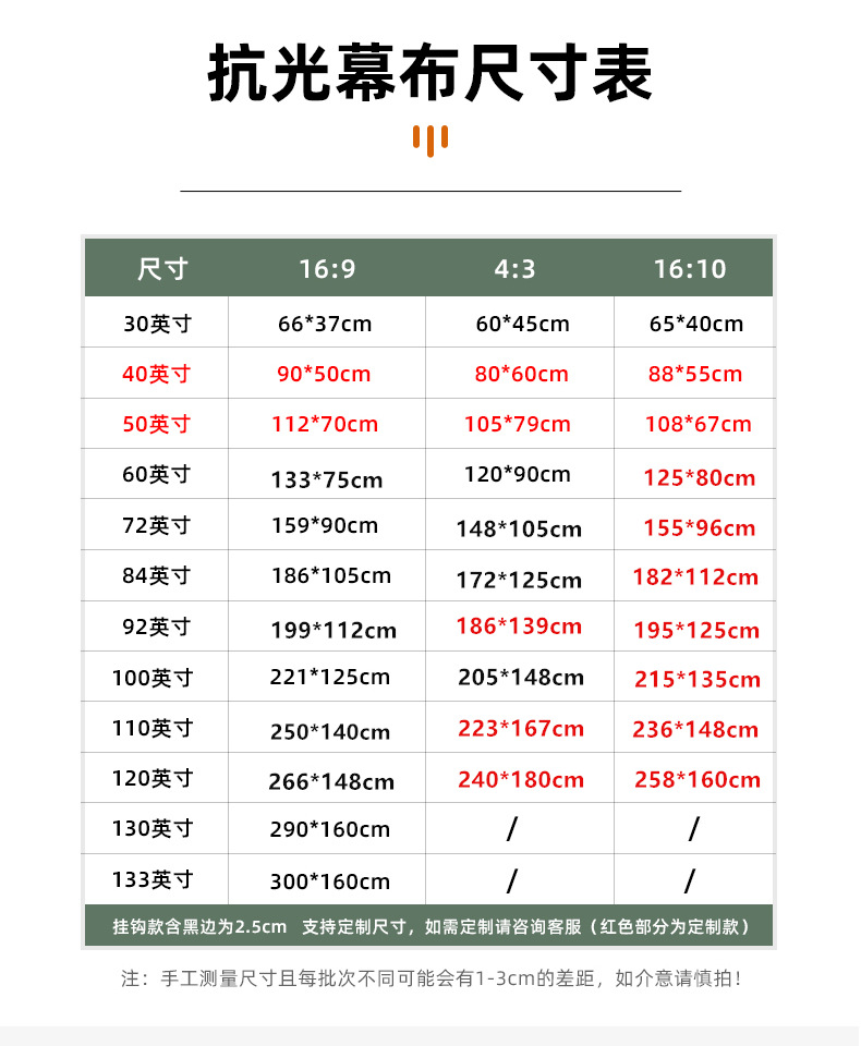 Черный край 60 дюймов 16 до 9 (ширина 1,33 * высота 0,75 м); Черный край 72 дюйма 16 до 9 (ширина 1,59 * высота 0,90 метра); Черный край 84 дюйма 16 до 9 (ширина 1,86 * высота 1,05 метра); Черный край 92 дюйма 16 до 9 (ширина 1,99 * высота 1,12 метра); Черный край 100 дюймов 16 к 9 (ширина 2,21 * высота 1,25 метра); Черный край 110 дюймов 16 к 9 (ширина 2,5 * высота 1,4 метра); Черный край 120 дюймов 16 до 9 (ширина 2,66 * высота 1,48 метра); Черный край модели 130 дюймов 16 до 9 (ширина 2,9 * высота 1,6 м) Складная картонная коробка; Черный край 133 дюймов 16 до 9 (ширина 3,0 * высота 1,6 м) Складная картонная коробка; Простые 60 дюймов 16 к 9 (ширина 1,33 * высота 0,75 м); Простая модель 72 дюймов 16: чем 9 (ширина 1,59 * высота 0,90 м); Простая модель 84 дюймов 16 к 9 (ширина 1,86 * высота 1,05 метра); Простая модель 92 дюймов 16 к 9 (ширина 1,99 * высота 1,12 метра); Простые 100 дюймов 16 к 9 (ширина 2,21 * высота 1,25 м); Простая модель 110 дюймов 16 к 9 (ширина 2,5 * высота 1,4 м); Простая модель 120 дюймов 16 к 9 (ширина 2,66 * высота 1,48 метра); Простая модель 130 дюймов 16 к 9 (ширина 2,9 * высота 1,6 м) Складная картонная коробка; Простые 133 дюймов 16 к 9 (ширина 3 * высота 1,6 м) Складная картонная коробка; Простая 30-дюймовая сложенная коробка с соотношением сторон 16:9 (ширина 0,37*высота 0.66m дюймов)