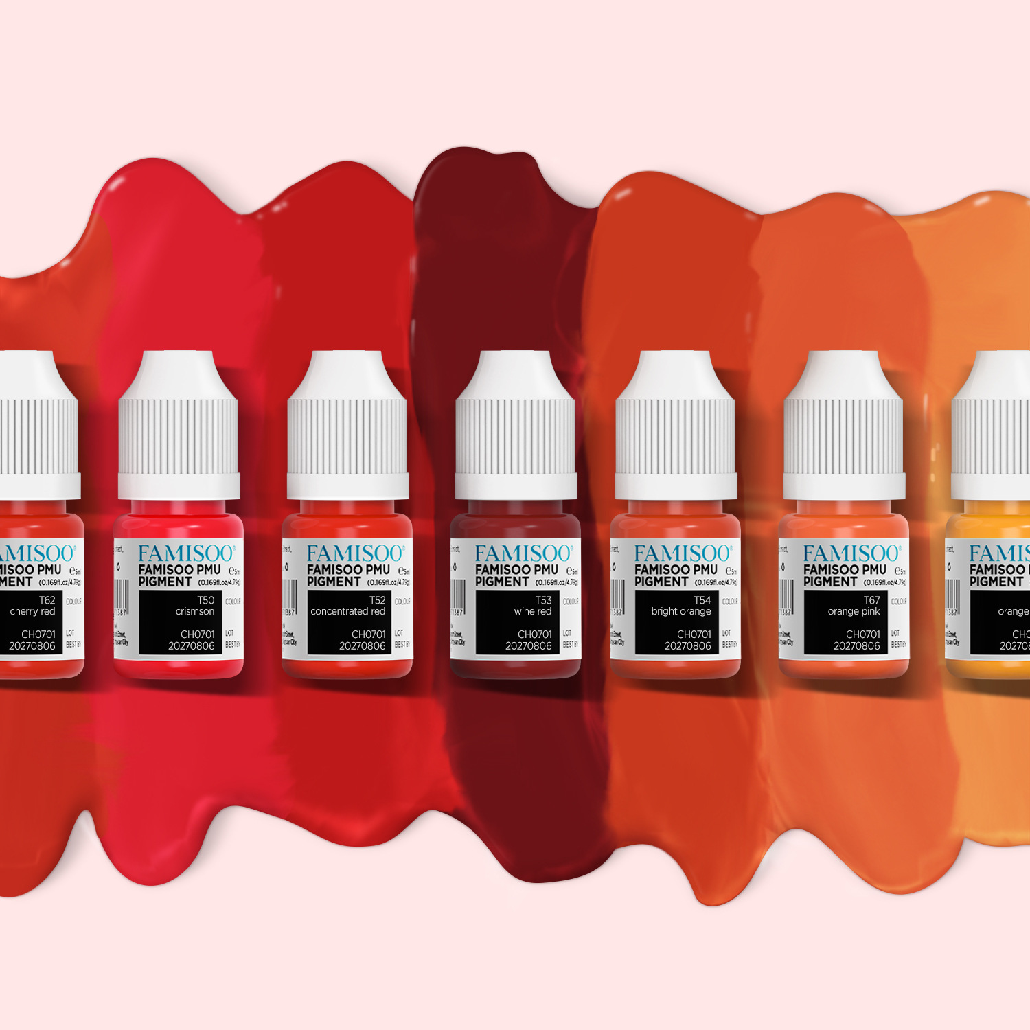 T62 Вишнево-красный; T50 клубнично-красный Crimson; T66 ярко-красный; T51 Супер Красный; T52 Концентрированный красный; T69 Ружево-красный; T64 настоящий красный; T53 винно-красный; T54 ярко-оранжевый; T67 ярко-оранжево-розовый; T65 Оранжево-красный Оранжево-красный; 346 очень красный; 347 чисто красный чисто красный; 348 красновато-оранжевый; 349 ярко-оранжевый; T56 Медовый коралл Коралле; T57 Медовая роза Мелроза; T58 Румянец Сакура; T59 теплый абрикосовый оранжевый Абрикосовый сияющий