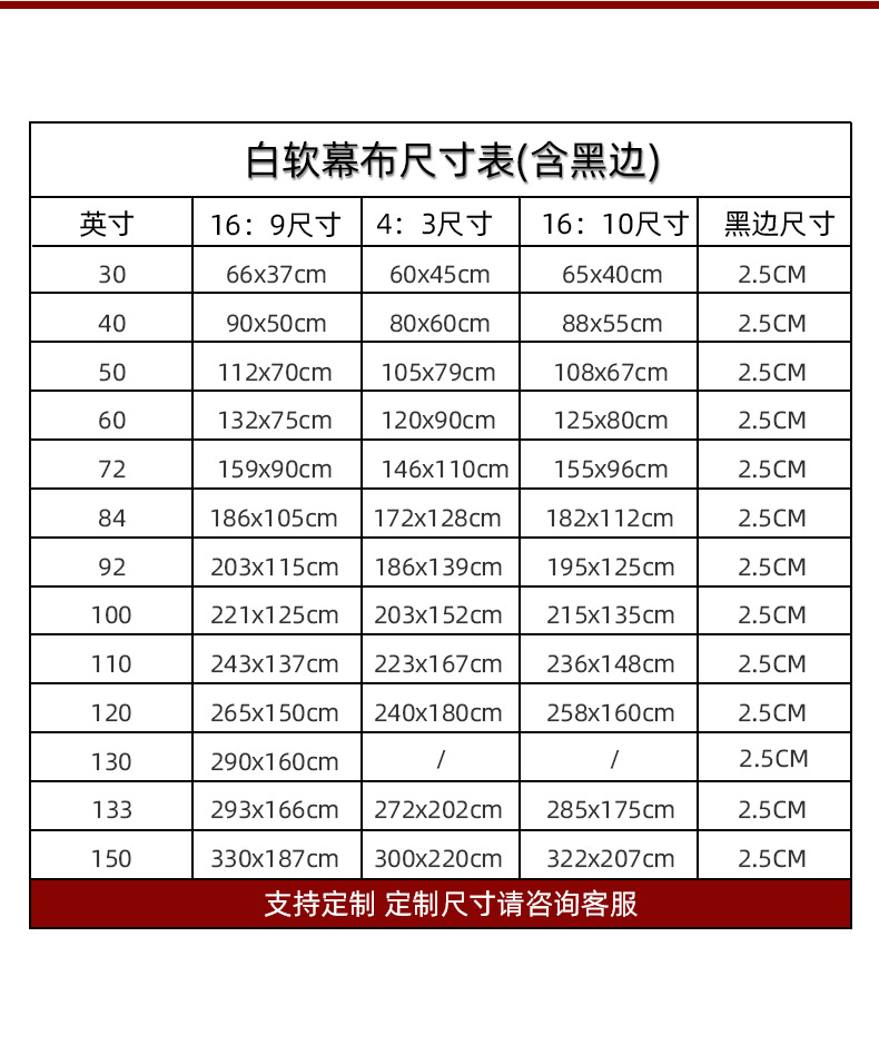 Тонкий 60 дюймов 16:9 (132*75 см); Тонкий 60-дюймовый 4:3 (120*90 см); Тонкий 72-дюймовый 16:9 (159*90 см); Тонкий 72-дюймовый 4:3 (146*110 см); Тонкий 84-дюймовый 16:9 (186*105 см); Тонкий 84-дюймовый 4:3 (172*128 см); Тонкий 100 дюймов 16:9 (221*125 см); Тонкий 100 дюймов 4:3 (203*152 см); Тонкий 120 дюймов 16:9 (265*150 см); Тонкий 120 дюймов 4:3 (240*180 см); Тонкий 150 дюймов 16:9 (330*187 см); Утолщенный молочный шелк - 60 дюймов 16:9; Утолщенный молочный шелк - 72 дюйма 16:9; Утолщенный молочный шелк - 84 дюйма 16:9; Утолщенный молочный шелк - 100 дюймов 16:9; Утолщенный молочный шелк - 120 дюймов 16:9; Утолщенный молочный шелк - 150 дюймов 16:9; Очень утолщенная занавеска из молочного шелка - 60 дюймов 16:9; Очень утолщенная занавеска из молочного шелка - 72 дюйма 16:9; Очень утолщенная занавеска из молочного шелка - 84 дюйма 16:9; Очень утолщенная занавеска из молочного шелка - 100 дюймов 16:9; Очень утолщенная занавеска из молочного шелка - 120 дюймов 16:9; Очень утолщенная занавеска из молочного шелка - 150 дюймов 16:9; Модернизированная модель 180 г (черно-белый двусторонний молочный шелк 60 дюймов 16:9); Модернизированная модель 180 г (черно-белый двусторонний молочный шелк 72 дюйма 16:9); Модернизированная модель 180 г (черно-белый двусторонний молочный шелк 84 дюйма 16:9); Модернизированная модель 180 г (черно-белый двусторонний молочный шелк 100 дюймов 16:9); Модернизированная модель 180 г (черно-белый двусторонний молочный шелк 120 дюймов 16:9); Модернизированная модель 180 г (черно-белый двусторонний молочный шелк 150 дюймов 16:9); Тонкий 30-дюймовый экран 16:9