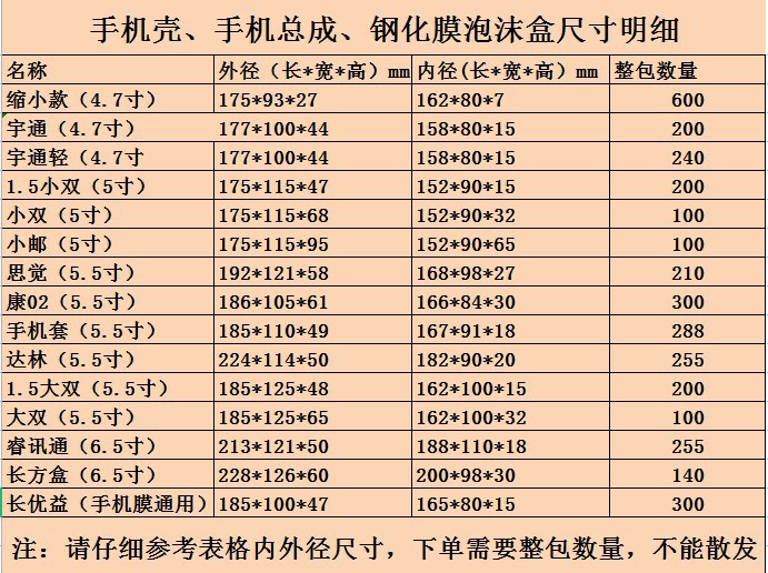 Уменьшенный (4,7 дюйма); Yutong (4,7 дюйма); Светильник Yutong (4,7 дюйма); 1,5 маленькая пара (5 дюймов); Маленький двойной (5 дюймов); Маленькая почта (5 дюймов); Сидже (5,5 дюйма; YMA02(5 дюймов); Кан 02(5 дюймов); Набор мобильных телефонов (5,5 дюйма); Дарин (5,5 дюйма); 1,5 больших двойных (5,5 дюйма); Большой двойной (5,5 дюйма); Руи Xuntong (6,5 дюйма); Длинная коробка (6,5 дюйма); Long Youyi (Универсальная пленка для мобильного телефона)