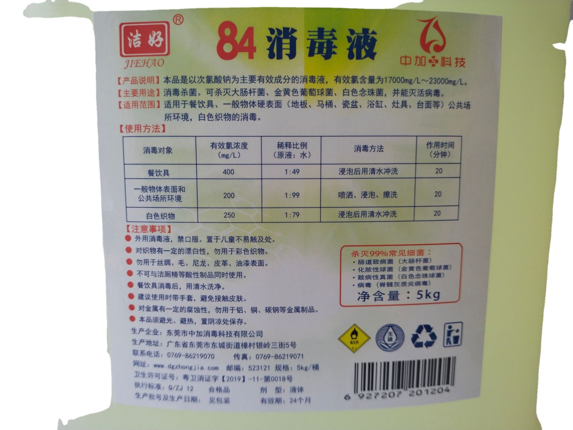 【产品说明】本品是以次氯酸钠为主要有效成分的消毒液,有效氯含量为17000mg/L--23000mg/L。