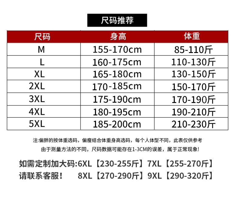 M/165; L/170; XL/175; 2XL180; 3XL/185; 4XL/190; 5XL/195; 6XL/200
