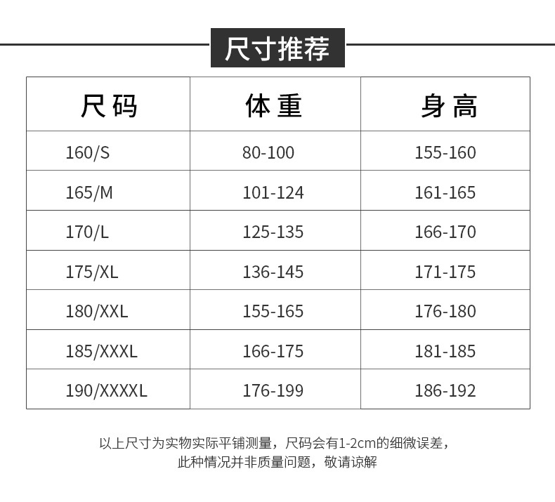 160-S; 165-M; 170-L; 175-XL; 180-XXL; 185-XXXL; 190-XXXXL