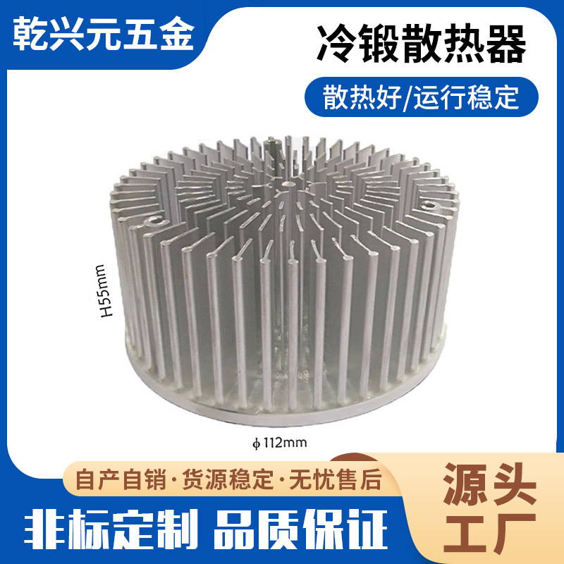 a、冷挤压散热器材质为1070纯铝,导热系数为226m.k,叶片可以做到0.8厚,增加产品热辐射表面积;同样体积形状的一体式散热器,可用于更大功率产品的散热,而重量更轻,节省更多运输成本