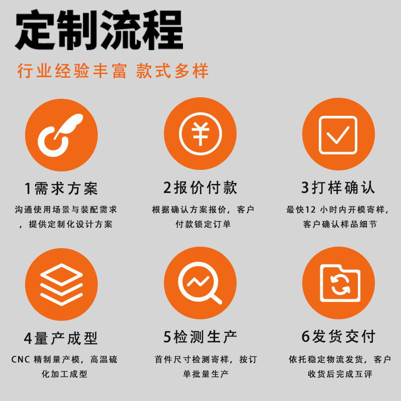 我们产品主要用到的原材料有硅橡胶(硅胶),丁腈橡胶和三元乙丙橡胶等,如果您对材质(种类、硬度、颜色等)有特殊要求,可以联系客户沟通。