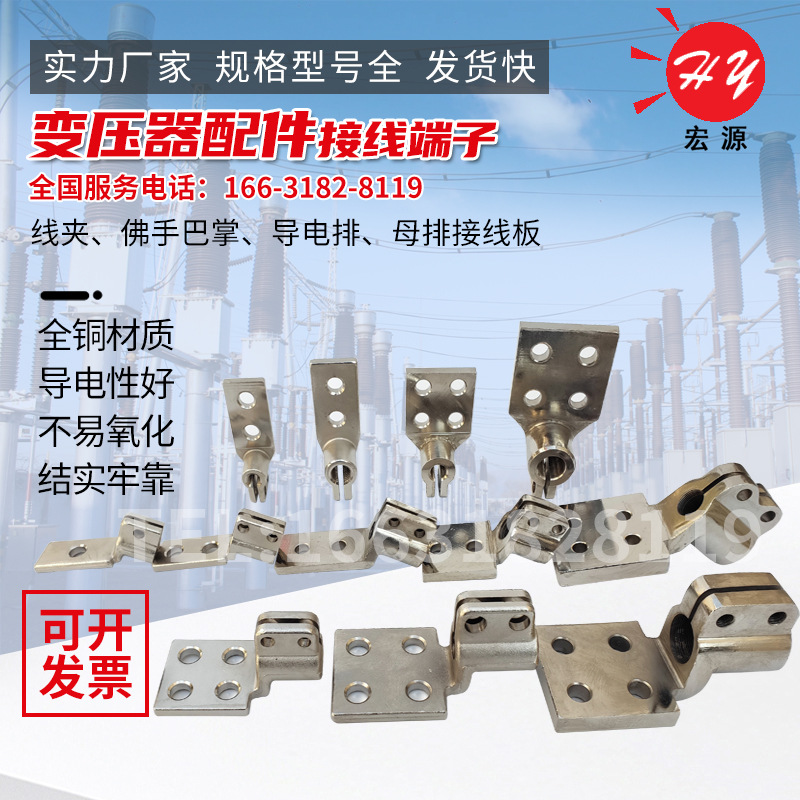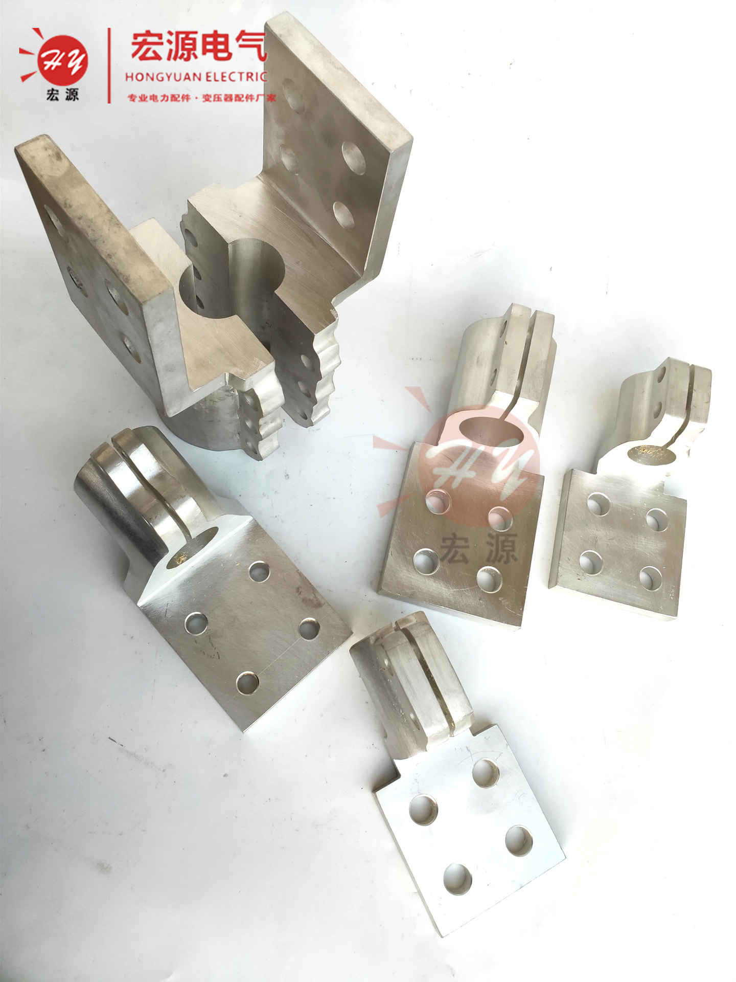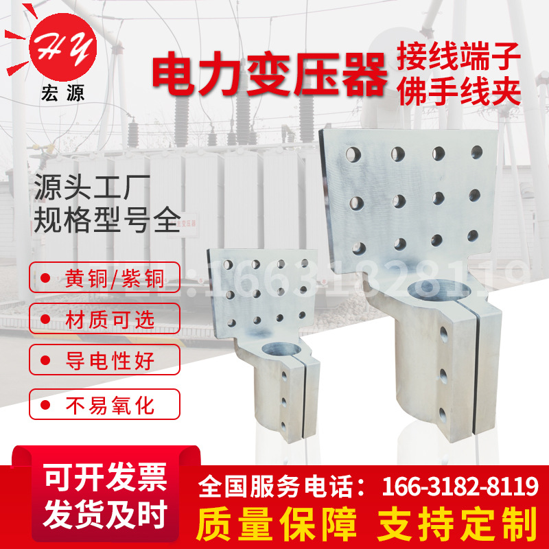 河北省武强县宏源变压器配件厂专业生产制造变压器配件接线端子型号齐全品质保证量大从优欢迎来电咨询16631828119,专业制造变压器黄铜铸造紫铜冲压设备佛手线夹主要用于变电所母线引下线与电气设备(如变压器,断路器,隔离开关,穿墙套管等)的出线端子连接,本品采用螺丝套加侧开缝设计原理安装在设备导电杆上后,按下线与安装电气设备端子所成角的不同分为0°、30°、90°三种。本线夹采用螺套加侧开缝设计,线夹安装在设备导杆上后,再拧紧开缝紧固螺栓,具有电气接触面积大,接触紧密牢固等优点。主要型号有:SBT12、14、16、18、20、24、30、33、36、42、45、48、52、56等。50kVA-2000kva变压器 高压低压M12-M62接线佛手