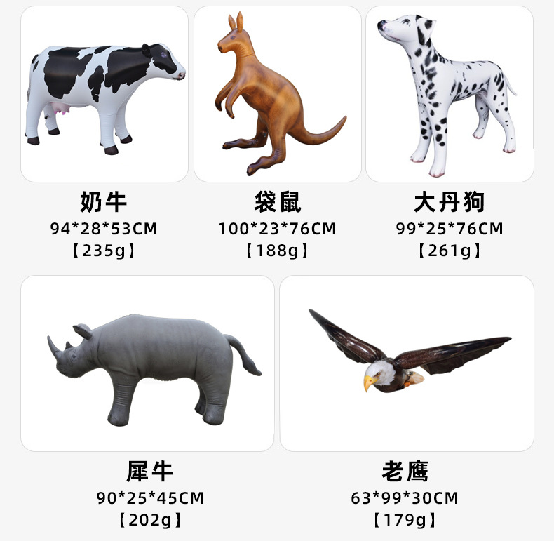 Кролик; Кролик (со светом); AN-ZEB3 Зебра; AN-ЛОШАДЬ; AN-GIRA3 Жираф; AN-ELE8 слоненок; АН-ЛЕВ; АН-ТИГЕР ТИГР; АН-РИНО; AN-EAGLE; AL-SHARK Акула; AN-GATOR Крокодил; Костюм тираннозавра Брахиозавра трицератопса; Тиранозавр DI-TYR3; DI-TRI4 Трицератопс; DI-RAPTOR Вишрон; DI-PTE Птерозавр; Брахиозавр DI-BRAC4; DI-SPINO Риджозавр; DI-STE8 Стегозавр; Корова; Великий дог; Кенгуру