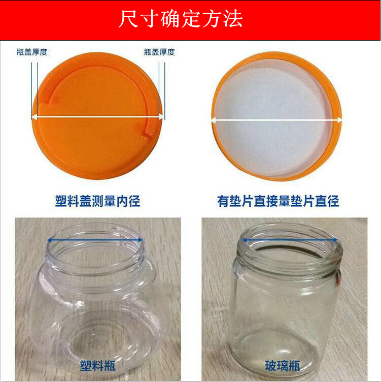 6.不建议用于密封具有腐蚀性和挥发性的液体产品。 1.用户只需把所需要规格,尺寸(依据瓶口来决定)告诉厂房,厂房提供所需尺寸。 2. 使用时只需把压敏垫片密封片放入瓶盖底部(印字的一面放瓶盖底部),然后拧紧瓶盖即可.
