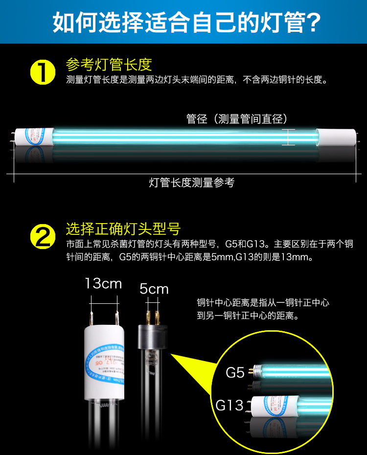 灯管有T5和T8二种规格,粗细不同T5灯管直径是1.5厘米,T8灯管直径是2.5厘米,他们是不通用的,选项标注的灯管长度为不含针长度,一定要联系客服下单.